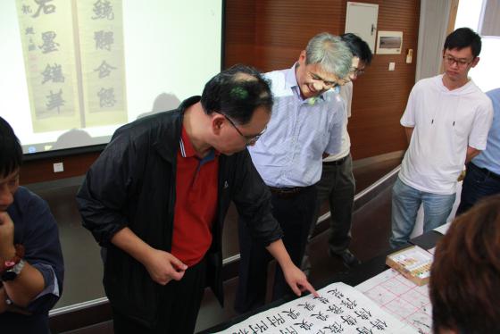 在随后的“喜迎新中国成立70周年华诞书画交流会”上,材料学院周钟鸣老师为师生们普及了中国书画常识。周老师从用笔、用墨、构图以及意境四个方面分享了中国画的品鉴技巧,同时以山水、人物、花鸟、果蔬等不同题材的中国画为例,向大家阐述了中国画从题材、笔墨、结构、意境方面都遵循“高(高洁、高尚)、大(大气、正气)、上(至尊、至雅)”原则。周老师强调,中国画不是一门纯粹的绘画艺术,而是通过笔墨描述意象表达认知和情感。在书法品鉴环节,周老师以不同风格的名家作品为例,通过点画线的强弱、浓淡、粗细等丰富变化,向大家展示了中国文字的变化微妙、形态不一、意趣迥异。