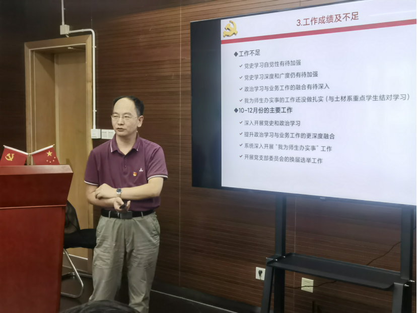 最后教职工第四党支部、研究生第四党支部、研究生第六党支部和研究生第七党支部书记分别对各支部工作近况予以介绍,并分享了支部“我为师生办实事“经验。