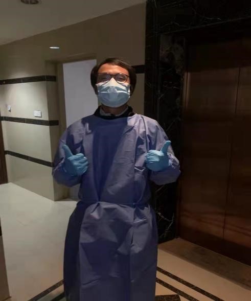 一波三折的“寻货之路”。谭庆刚老师先是在学院高分子材料系群里发了求助信息寻找货源,系里的老党员任杰老师积极帮忙联系到了昆山的供应商,但由于位处外省,运送困难,没有成功购货。之后,谭老师通过社区党员服务群成功地在上海联系到了500套隔离服货源。