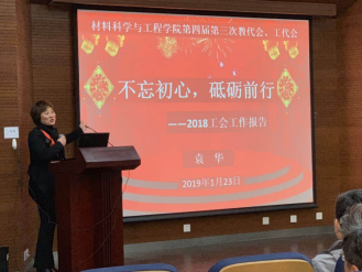 工会主席袁华作学院工会工作报告和学院工会财务情况报告。袁华回顾了2018年工会工作,总结了材料学院工会在围绕学院中心工作,服务发展大局,加强学院民主管理,保障教师权利和促进教师身心健康发面做出的积极有效的工作,最后明确指出了2019年工会工作的努力方向。袁华说,2019年,学院工会将进一步全面深化改革,秉承初心,砥砺前行,勤勤恳恳为大家服务。