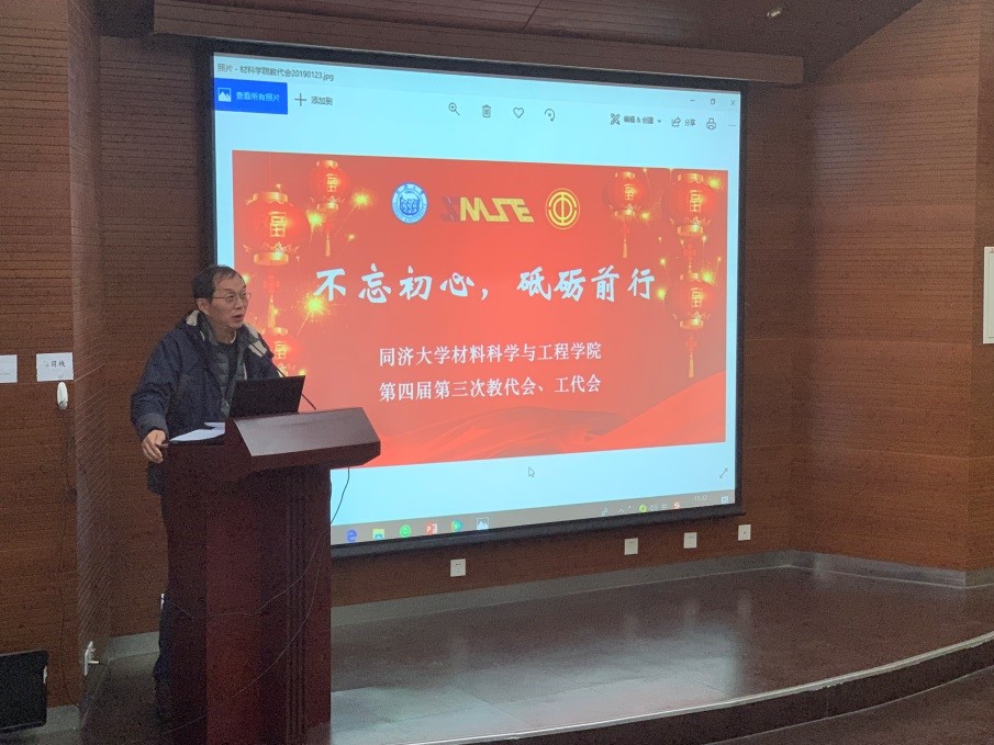 2019年1月23日,6776永利集团以“不忘初心,砥砺前行”为主题在yl6776永利集团嘉定校区德才楼二楼报告厅召开了第四届教代会暨工代会第三次全体会议。材料学院学科主任黄云辉、党委书记王中平、党委副书记袁华、王凌凌,,学院教代会代表及列席代表共33人出席了会议。姚武、邱军副院长列席了会议.