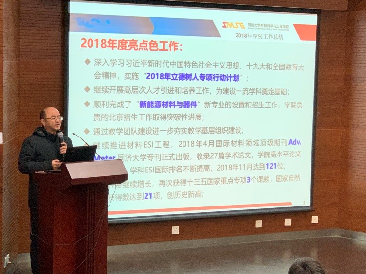 黄云辉院长作2018年学院工作报告。黄院长回顾了2018年学院的特色工作,然后分别从学院的师资和人才工作、人才培养和教学、科研与平台、实验室工作和安全、永利集团、财务决算六个方面全面汇报了2018年度学院取得的主要工作成绩。系统总结了事业健康快速发展的成功经验,深刻分析了学院进一步发展面临的形势、特别是国家“双一流”建设带来的重大机遇和挑战,明确提出和部署了2019年学院改革发展的工作思路和重点工作任务。王中平书记作学院财务情况报告,汇报了2018年财务预算执行情况。