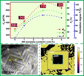 6776永利集团翟继卫教授课题组长期致力于无铅压电材料的研究,近期该课题组与澳大利亚卧龙岗大学张树君教授合作,通过采用织构化工艺以及对铌酸钾钠(KNN)基压电陶瓷成分的设计和烧结工艺的优化制备出具有高织构度的KNN基压电陶瓷,其压电系数d33高达~700 pC/N,机电耦合系数kp为76%,电致应变量~0.3%,同时该材料具有高的居里温度和相对优异的电/热性能稳定性。该研究发现高的压电性能主要来源于三个方面:(Ⅰ)充分利用压电晶体的各向异性设计了具有<001>取向的正交(O)和菱方(R)相共存的晶体结构,该结构具有最合适的工程畴结构,即较多的能量等价的极化矢量(Ps)数以及极化矢量和外电场方向较小的夹角θ。(Ⅱ)织构陶瓷在外电压作用下产生的高的晶格畸变是压电性能提高的本征贡献。另外,极化过程中产生的新的中间相有利于极化过程的实现。(Ⅲ)TEM和PFM表征的结果发现织构陶瓷中由于模板晶粒的引入导致的电畴尺寸的减小(纳米畴)有利于畴壁在外电场作用下的移动。