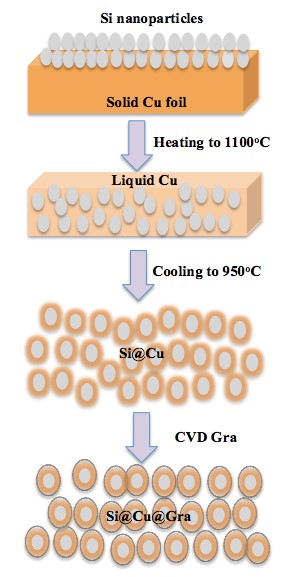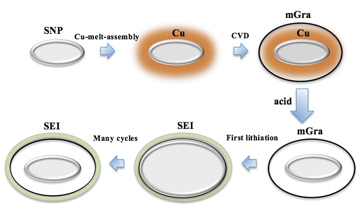 离子二次电池中负极材料作为储锂的主体,在充放电过程中实现锂离子的嵌入与脱出,对电池的性能有至关重要的影响。目前,商业化的锂离子电池的负极主要采用石墨为负极材料(比容量372 mAh/g),但是存在比容量低、首次充放电效率低、与电解液发生反应等缺点。因此,今后一段时间内锂离子电池负极材料的研究热点将主要集中开发具有高比容量、高倍率性能、长循环寿命、低成本、高安全的新型可替代石墨的负极材料。硅作为合金基的电极材料在所有的已报道的电极材料中具有最高的比容量(4200 mAh/g),硅元素在地壳中储量丰富(27%)、价格低廉,清洁无污染,有望成为下一代高比能锂离子电池的负极材料之一,但是由于硅较低的电导率(~2x10-4/米欧姆),极大的体积膨胀效应(400%),持续的新的固体电解质界面的形成(SEI),以及低的首次库仑效率,硅电极材料在充放电过程中会粉化从而从集流体上脱落,使得活性物质之间及活性物质与集流体之间失去电接触,最终导致充放电容量的急剧下降。最近该课题组创新性地利用热熔融-组装金属铜的方法,在纳米硅粒子表面包覆一层铜,然后通过化学气相沉积的方法原位可控的制备了单层及几层的石墨烯包覆的Yolk-Shell式纳米复合结构,利用单层石墨烯高的杨氏模量(1100GP)和优越的导电性,该纳米结构显示出了优异的循环稳定性和高的首次库仑效率。此方法可以实现在纳米硅表面进行纳米石墨烯的可控制备,就像审稿人所说的,是一次真正意义上硅-石墨烯纳米复合材料的突破。同时,该研究为有目的构筑、调控纳米复合结构和研发新型电极材料提供了有益的启示。该文章的发表是我校在纳米能源材料领域研究的重要突破。