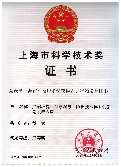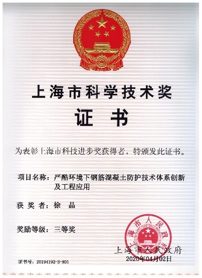 近日,经美国工程院院士、中国工程院外籍院士S.P. Shah教授推荐,由我院土木工程材料系徐晶副研究员、姚武教授作为主要完成人,与上海建工集团股份有限公司、南京水利科学研究院等共同合作完成的“严酷环境下钢筋混凝土防护技术体系创新及工程应用”,荣获2019年度上海市科技进步三等奖。