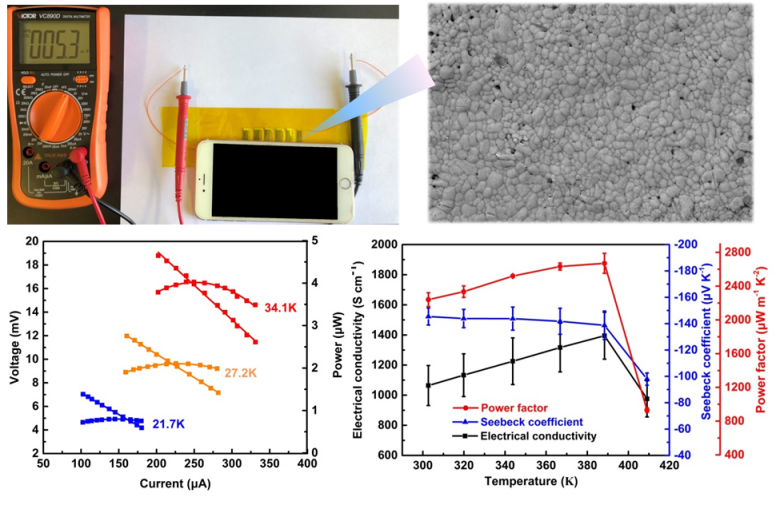 将复合膜组装成6个热电单臂柔性热电器件,在温差34.1 K时的最大功率密度高达37.6 W m-2。归一化的最大功率密度PDmax·l/ΔT2也高于已报道的柔性热电器件的值。将该6单臂器件放置于刚运行过游戏软件的手机下,手机温度与室温间9.4 K的温差下,该柔性热电器件产生了5.3 mV的电压。表明这种超高性能柔性热电薄膜在可穿戴设备中有潜在的应用。上述工作以 “Exceptionally high power factor Ag2Se/Se/polypyrrole composite films for flexible thermoelectric generators”为题发表于Advanced Functional Materials上。论文第一作者为6776永利集团硕士生李雅婷,通讯作者为蔡克峰教授,共同通讯作者为南方科技大学何佳清教授。