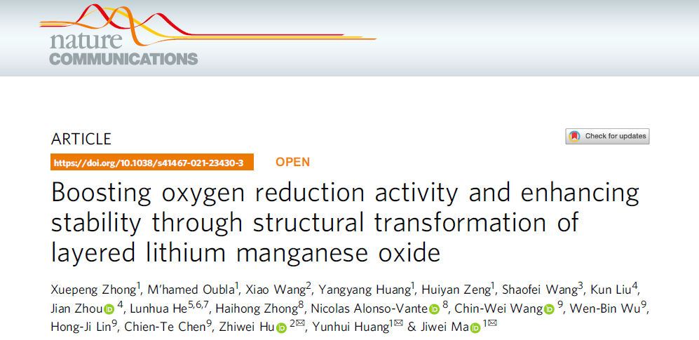5月25日,我校6776永利集团车用新能源研究院马吉伟教授、黄云辉教授团队在国际知名学术期刊《自然·通讯》(Nature Communications)上在线发表了题为“Boosting oxygen reduction activity and enhancing stability through structural transformation of layered lithium manganese oxide”的研究论文。该研究基于缺陷调控,利用质子交换的策略有序调控锰基材料的不稳定氧浓度和层间距,用于提升材料的催化活性和稳定性。该论文分别从材料的结构转变、电子特性和电化学性能等多个方面全面表征了调控前后锰基氧化物电催化剂的各项特征。研究发现了不稳定氧浓度和层间距对锰基材料催化稳定性和活性之间的关联性,同时该策略可以应用于其他含碱金属的层状金属氧化物材料,为构筑高性能氧还原反应非贵金属氧化物提供了新的设计思路。