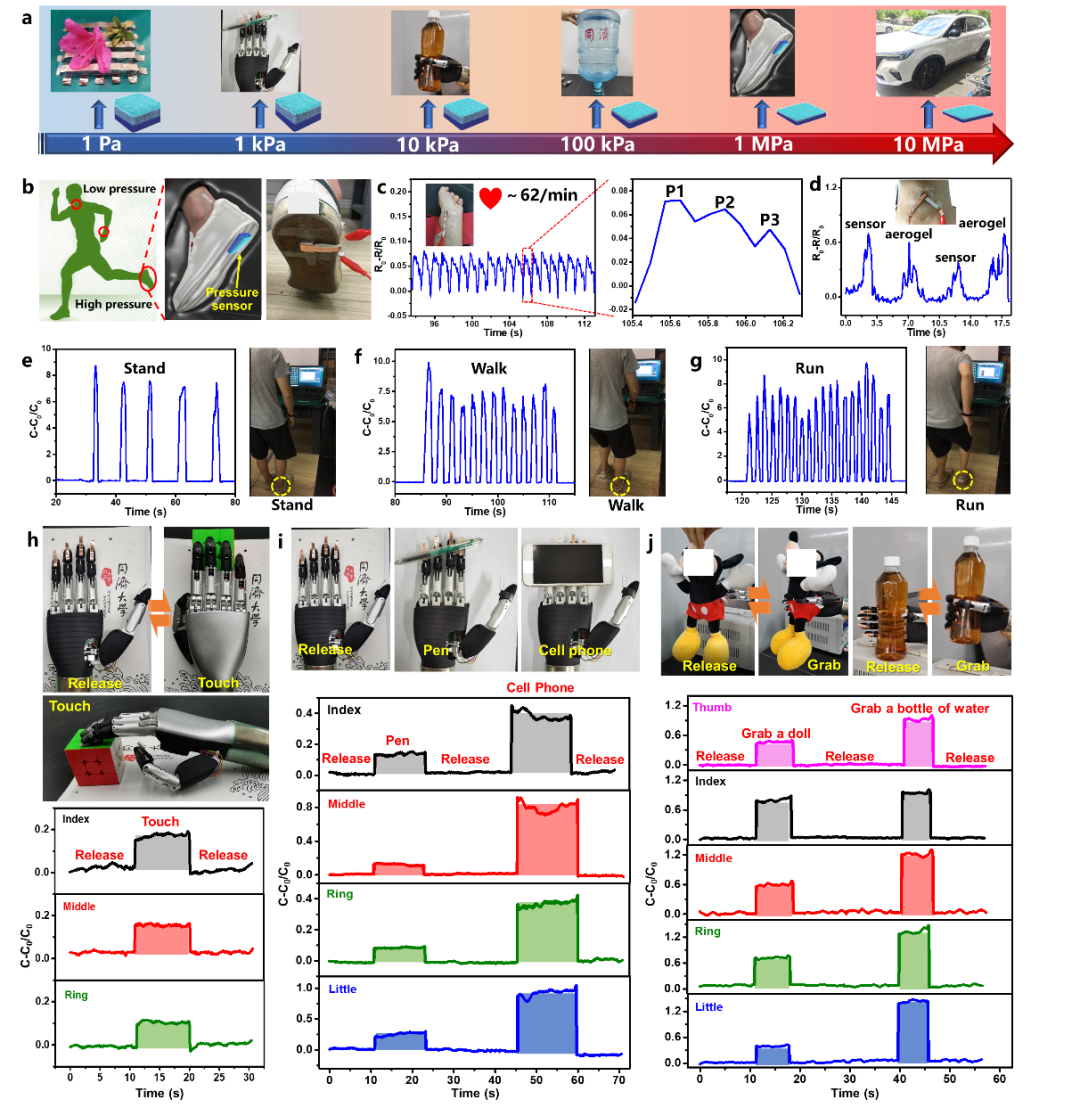 图3 梯度气凝胶压敏电子器件用于监测人体运动/生理信号以及宽范围触觉感知仿生手