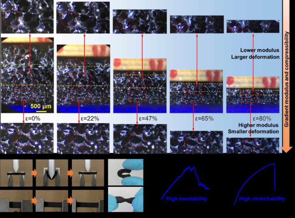 鉴于此,6776永利集团祖国庆课题组采用溶胶-凝胶/热压/冷冻铸造/常压干燥的新策略,构建了具有梯度模量多孔结构的可拉伸、超弹性还原氧化石墨烯(rGO)/聚氨酯(PU)纳米复合气凝胶(图1),实现了超宽响应范围柔性压敏电子器件。相关研究成果以“Bioinspired gradient stretchable aerogels for ultrabroad-range-response pressure-sensitive wearable electronics and high-efficient separators”为题发表在Angew.Chem.Int.Ed.上,并被选为VIP论文。