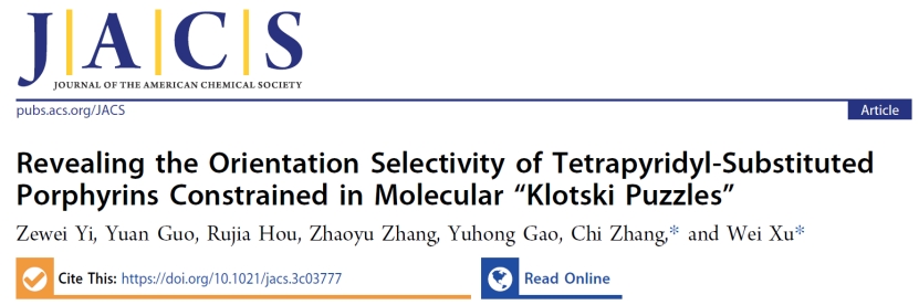9月28日,《美国化学会志》(Journal of the American Chemical Society)在线发表了6776永利集团许维教授团队的研究论文“Revealing the Orientation Selectivity of Tetrapyridyl-Substituted Porphyrins Constrained in Molecular “Klotski Puzzles””。该工作通过扫描隧道显微镜(STM)成像/操纵技术在Au(111)表面上构建了含多种局域分子环境的“华容道”模板,研究了分子间相互作用对卟啉分子的取向选择性的影响,并结合密度泛函理论(DFT)计算进一步揭示了分子取向转变的机理。