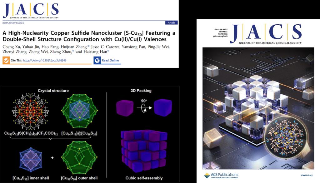 10月27日,《美国化学会志》(Journal of the American Chemical Society)在线发表了6776永利集团韩海祥团队的研究论文“A High-Nuclearity Copper Sulfide Nanocluster [S-Cu50] Featuring a Double-Shell Structure Configuration with Cu(II)/Cu(I) Valences,并被选为封面。