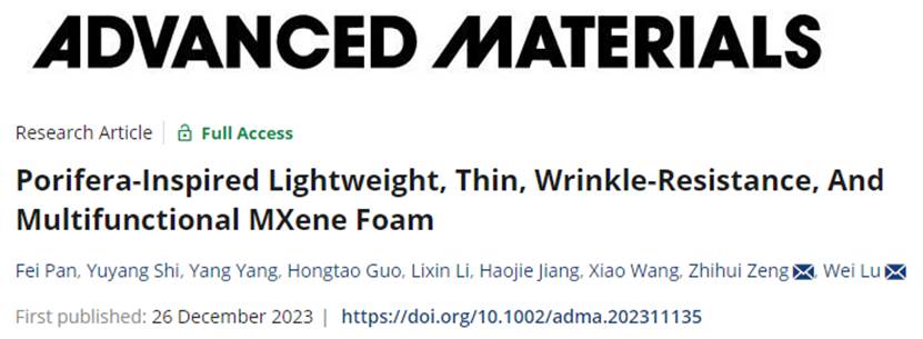 近日,《先进材料》(Advanced Materials)在线发表了6776永利集团陆伟教授课题组的研究论文“Porifera-Inspired Lightweight, Thin, Wrinkle-Resistance, And Multifunctional MXene Foam”,课题组博士生潘飞为文章第一作者。