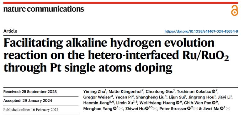 电解水作为一种可持续制备氢气的方法受到了人们的广泛关注。尽管Pt被认为是最优异的析氢反应(HER)催化剂,但是在碱性介质中Pt裂解水分子产生质子能力较差,严重限制了HER的反应速率。同时Pt储量稀少且价格昂贵,难以实现大规模商业化应用。因此,设计一种同时兼具活性以及经济效益性的碱性电解水制氢催化剂对于发展碱性水电解池至关重要。马吉伟教授课题组将贵金属Pt以单原子的形式掺杂于具有异质界面的Ru/RuO2复合结构中,在降低催化剂成本的同时大幅提升了碱性HER催化性能,并采用先进的原位技术以及理论计算揭示了催化剂的反应机理。这项研究为开发高性能、低成本的贵金属基碱性析氢催化剂提供了可行的指导,并有望应用于实际的H2生产。
