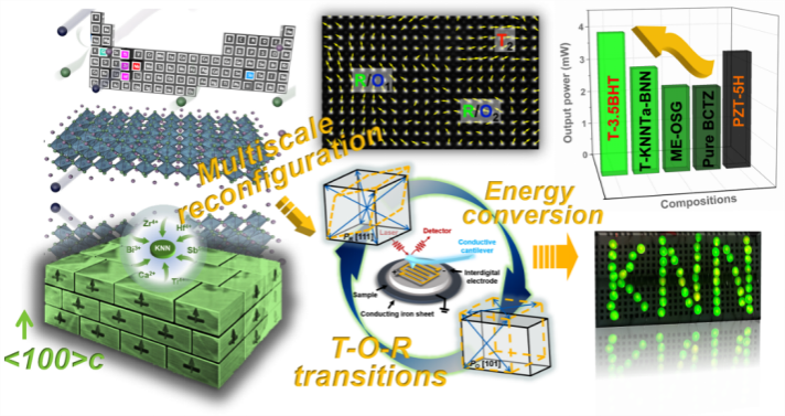 我院翟继卫教授研究团队为了弥补单纯采用NPB相界策略在KNN基陶瓷的压电性能改善过程中所带来的难以实现饱和极化问题,利用织构化工艺和中熵诱导NPB相界策略的协同优化,基于模板晶体生长法(TGG)以及两步烧结法制备了T-xBHT织构压电陶瓷,深入探究了多尺度重构对xBHT压电陶瓷性能的影响规律。所开发的中熵T-xBHT织构陶瓷具有优异的综合压电性能(d33 ~ 680 ± 35 pC/N, kp ~ 72.5%, Tc ~ 260 ℃),从而表现出优异的压电能量收集和超声换能特性,在无铅和铅基压电陶瓷中都具有很强的竞争力。综合结构分析表明,电场诱导多尺度极化配置的不可逆高效翻转促进了高饱和的极化。该项工作不仅展示了高性能KNN基压电陶瓷设计的新思路,并为压电性能和潜在的多尺度结构建立了密切联系。