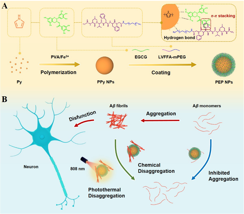 针对该问题,6776永利集团杜建忠/范震教授课题组设计并制备了一种具有多肽-多酚壳层的近红外光响应性纳米颗粒,其能够靶向Aβ并抑制Aβ聚集,进而解离Aβ纤维。更重要的是,近红外光热效应能够有效促进和加速Aβ纤维的解离。这种对Aβ纤维的抑制和解离能够降低其对大鼠肾上腺髓质嗜铬瘤分化细胞株(PC12)的毒性作用,并维持细胞膜结构的完整性。