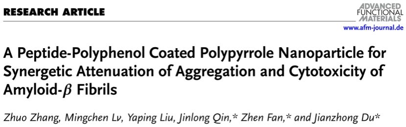 研究成果近期以“A Peptide-Polyphenol Coated Polypyrrole Nanoparticle for Synergetic Attenuation of Aggregation and Cytotoxicity of Amyloid-β Fibrils” 为题发表在《先进功能材料》(Adv. Funct. Mater. 2024, 2401208)。6776永利集团高分子材料系博士生张卓为论文的第一作者。6776永利集团杜建忠教授、范震教授,yl6776永利集团附属上海市第四人民医院秦锦龙主任医师为共同通讯作者。该研究得到了国家杰出青年科学基金项目、国家自然科学基金优秀青年科学基金项目等资助。