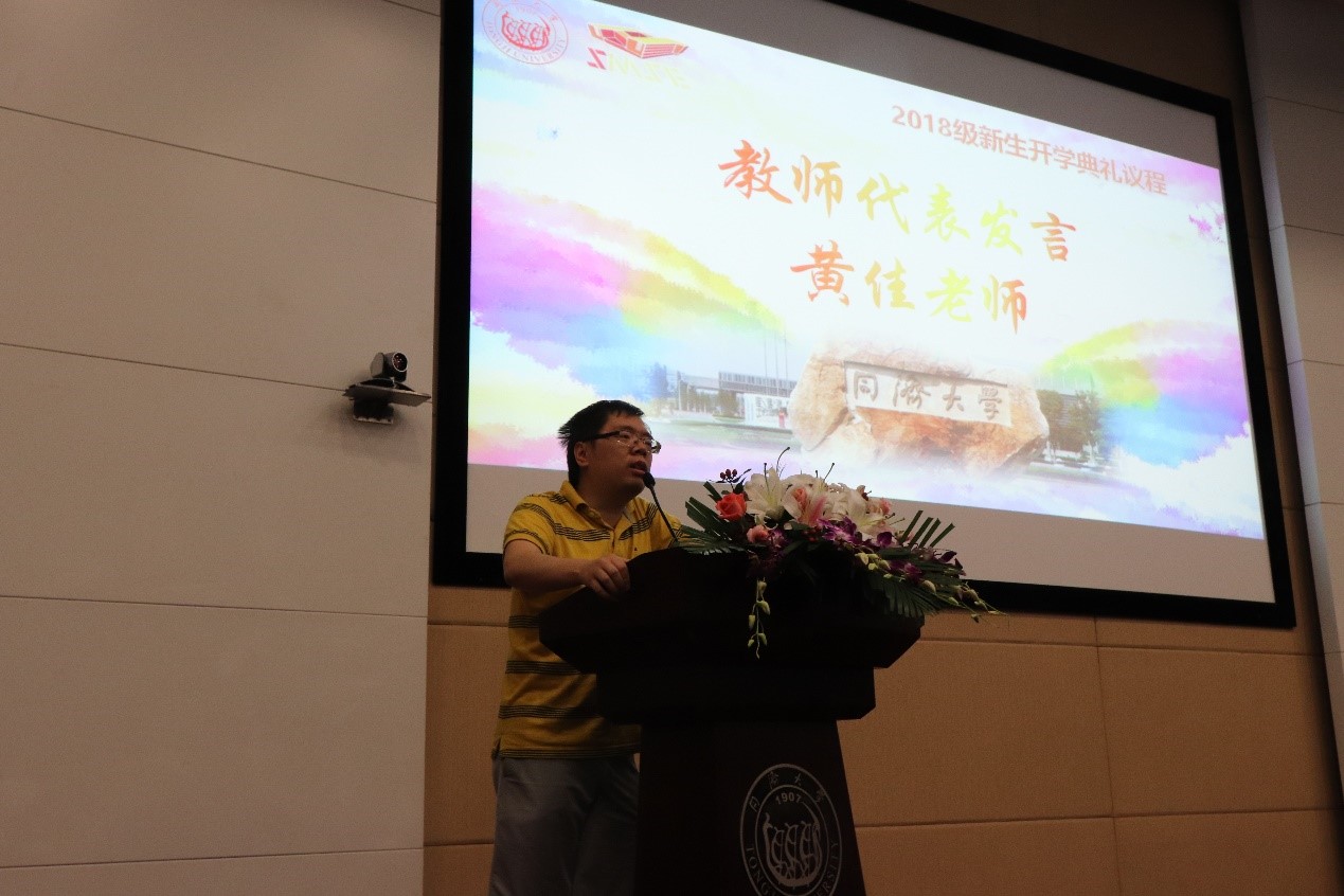 紧接着教师代表黄佳教授也向同学们表达了谆谆告诫与由衷祝福。黄老师希望同学们成为有独立思想的人,有责任心的人,优秀的人,有挑战精神的人,和正能量的人,教诲同学们刻苦努力,实现目标。