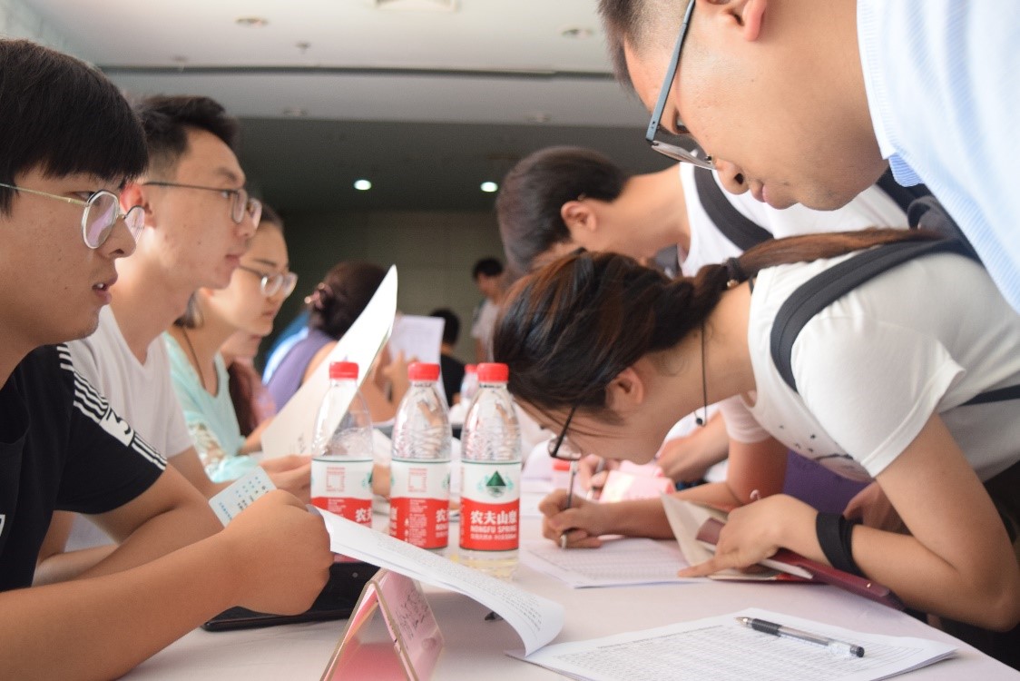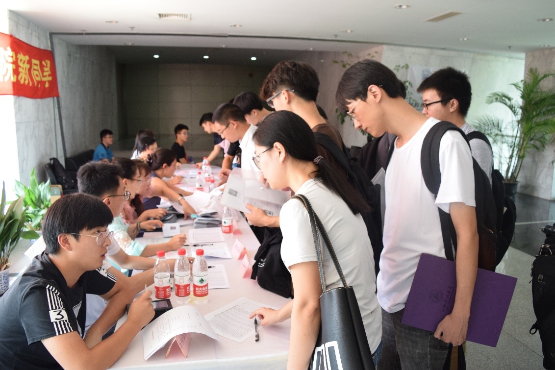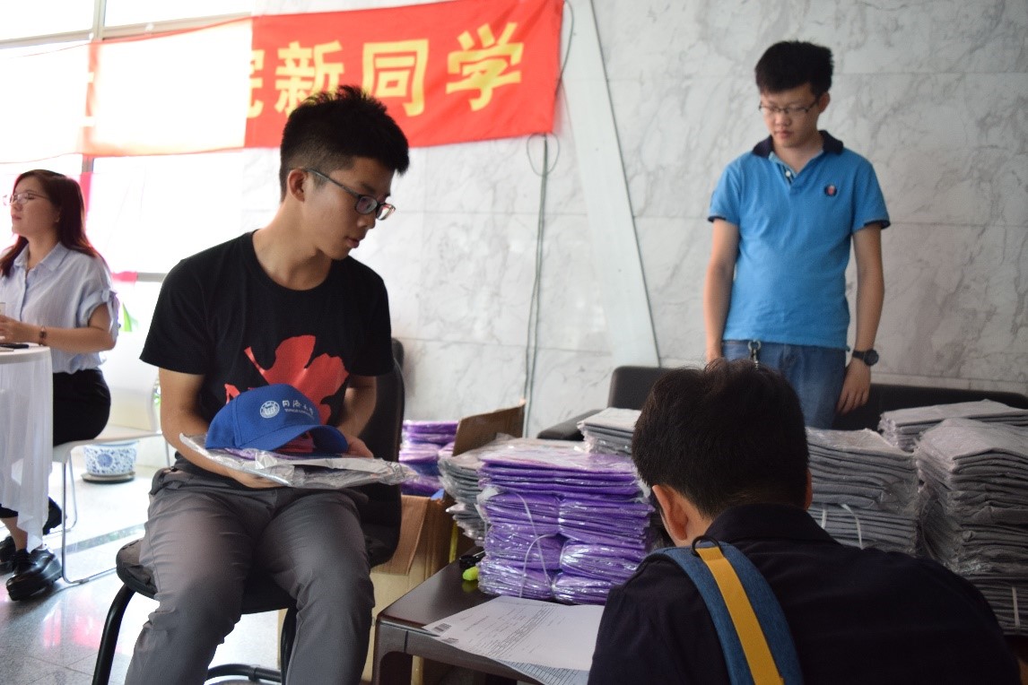上午11点50分,现场迎来了第一批学院研究生新生,工作人员立即忙碌起来;12点整,迎新活动迎来一波小高潮,320旁排起了长队,从扫描身份证、查验应届生毕业证书与学位证书、收取户口迁移证、党组织关系介绍信、发放研究生证及校徽、解读培养计划、发放入学安排,再至各班班主任处报到、分发材料,最后领取院服等,整个流程有条不紊得进行,每一个环节均会有负责的老师陪同,每一个步骤均会有热情的工作人员辅助,迎新工作持续顺利进行中。