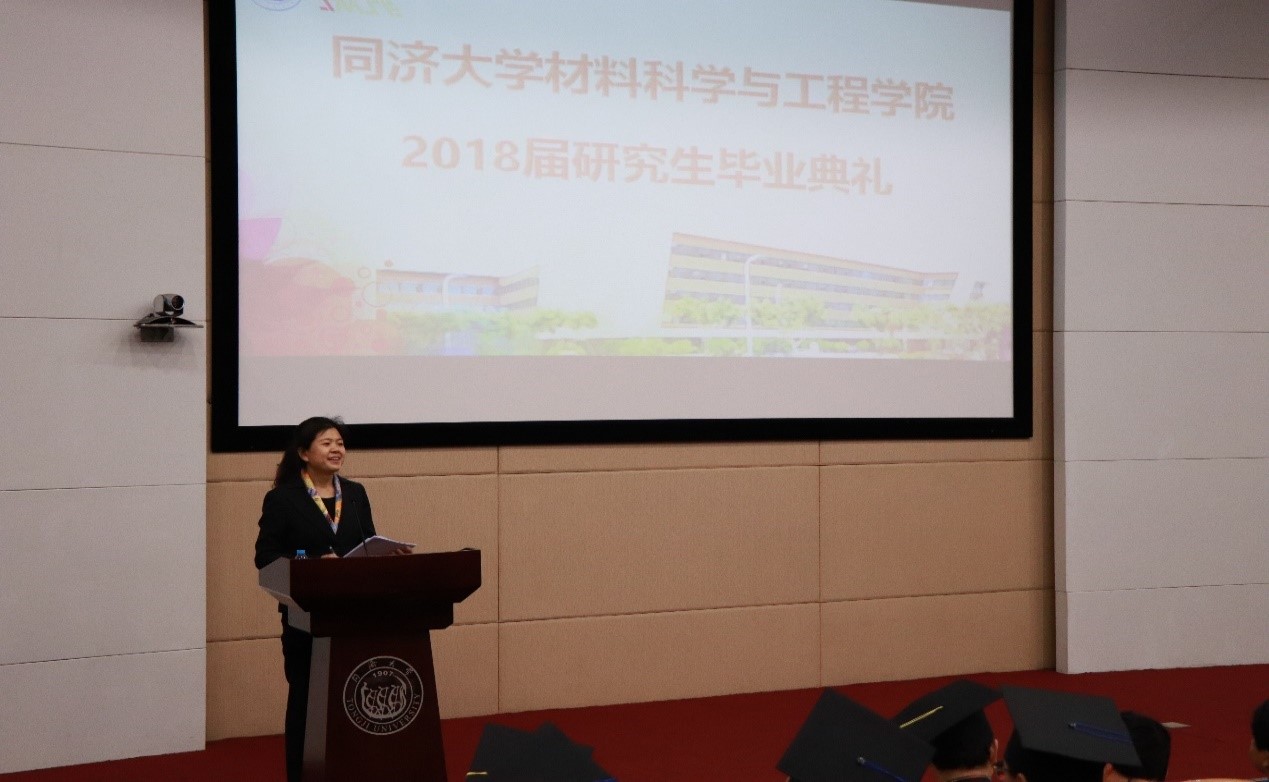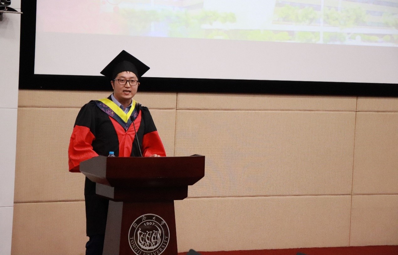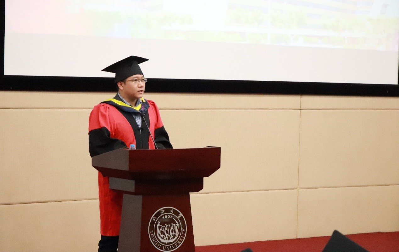 2018年上海市优秀毕业研究生、yl6776永利集团第十一届研究生“学术先锋”潘仲彬博士代表全体毕业生发言,他以人生选择和个人经历感慨学无止境,三载求学春秋,强大的信念支撑,一贯的坚持不懈,成就了自信满满、追求卓越的我们。他真挚感谢母校包容了我们的懵懂无知,孕育了我们的成熟睿智。大家相约,即便走得再远也要记得回来,特别为母校、材料学院的明天再留下一份情、一份心。无论何时何地,将同济人“同舟共济、自强不息”的精神发扬光大。