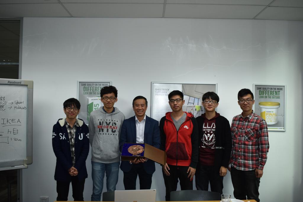 午餐期间,技术研发总监与我们轻松地聊起了天。他向我介绍了一些在澳洲的经历,也向我们询问了兴趣爱好,同时我们也向他介绍了yl6776永利集团的生活,气氛十分欢乐且轻松愉快。午餐结束后,我们开始深入交流。技术研发总监向我们介绍了优时吉博罗公司的历史背景以及公司理念,同时,他也让我们随时畅所欲言,不要拘束。在介绍的过程中,我们就总监在介绍过程中产生的疑问以及之前在创新大赛中的合作成果,向总监提出了一些想法和疑问。通过质朴浅显的示意图,总监充满激情地为我们一一解答,回答了我们的问题并肯定了我们大胆的想法。最后,我们向公司送出了yl6776永利集团的纪念品作为学院的一点心意,并与总监在公司前合影留念。