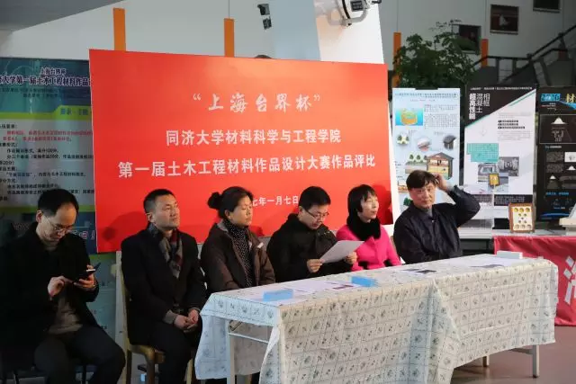 莅临指导本次活动的来宾和评委阵容不可谓不豪华:上海台界化工有限公司董事长邵田云先生,上海市建筑建材业市场管理总站主任、yl6776永利集团兼职教授贺鸿珠博士,上海城建设计院总工郭卓明教授级高工,上海城建物资有限公司总工徐亚玲教授级高工,6776永利集团党委书记王中平、副书记王凌凌,学工办宋文娟老师,材料学院资深教授王培铭老师和施惠生老师,无机材料系主任严彪老师,高分子材料系主任杜建忠老师,土木工程材料系主任孙振平老师、副主任蒋正武老师和支部书记张国防老师,以及朱洪波老师、吴凯老师等。