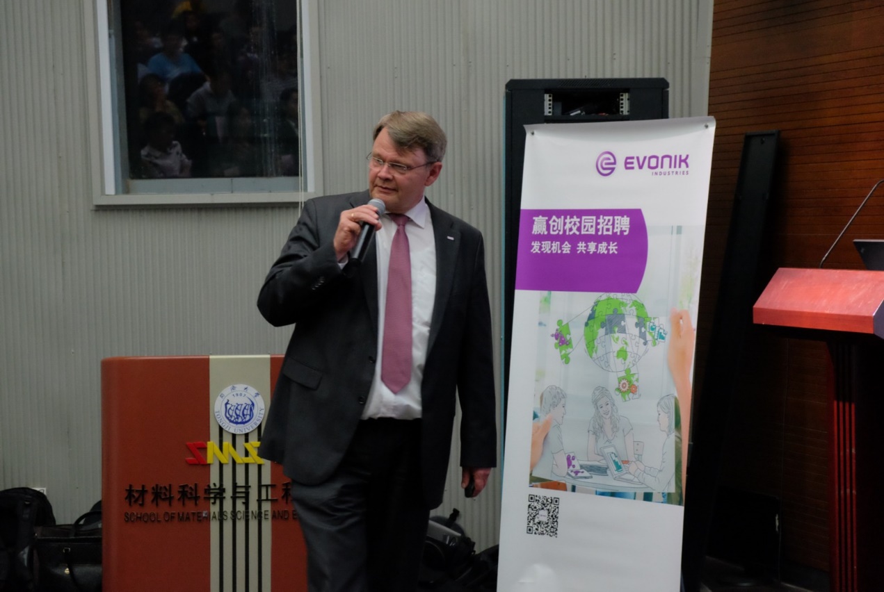 2016年10月17日晚,赢创2017同济首场招聘会在yl6776永利集团嘉定校区材料学院德才馆顺利举行。赢创大中华区总裁柯乐施(Dr Claas Klasen)博士、赢创特种化学(上海)有限公司总经理陈金秋博士、赢创德固赛(中国)投资有限公司人力资源总监程大年、赢创特种化学(上海)有限公司业务项目经理陆芳(同济校友)等做客宣讲会,学院副院长邱军、党委副书记王凌凌出席。来自同济、交大等高校的各专业的2017届本、硕学生约100人与会。