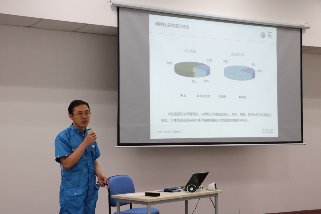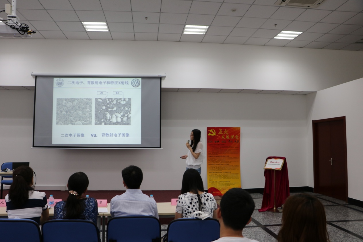 揭幕仪式结束之后,《漆材·众济》讲堂第二讲——理论篇开讲。随后是来自上汽大众安亭汽车二厂一支部的宣传委员陈杰同志带领党员们学习了“五大发展理念引领中国未来”的报告,使全体党员领会到“五大发展理念”中发展的动力、平衡、载体、空间与成果是一个有机整体,大家对“五大发展理念”形成全面的领会,党员同志在学习之后积极发言交流学习感受,针对学生党员而言,需要积极参与创新项目,成为综合型、全方位的高素质人才,拥有开放包容的性格与公平的心态。对于企业,需要创新的科学技术、协调企业结构与产品形式、提高持续发展的能力、坚持“走出去”的理念、构建和谐的发展体系,促进企业综合竞争力的提升。随后来自上汽大众安亭汽车二厂一支部的王宗明同志为学生党员介绍了“2010v涂装工艺”,对水性漆、溶剂性漆的应用、优缺点及区别做了详细介绍,使学生党员对于涂装工艺形成初步认识。接着,6776永利集团高分子系研究生党支部党员黄秋桐同志,为全体党员讲解了“扫描电子显微镜及能谱分析仪”,使企业党员对于材料表征技术具有更为直观的了解,为后期双方在专业方面的合作奠定基础。