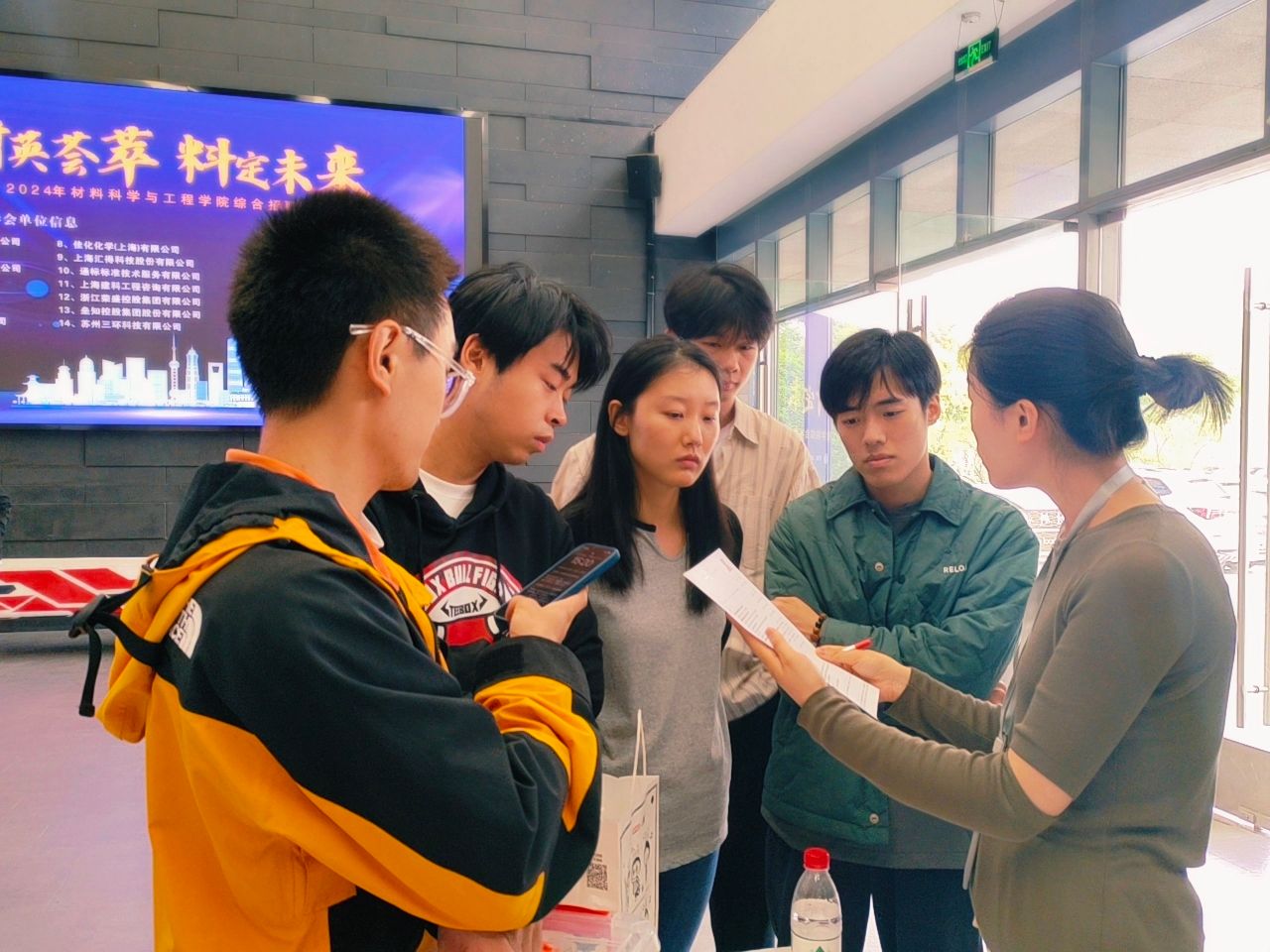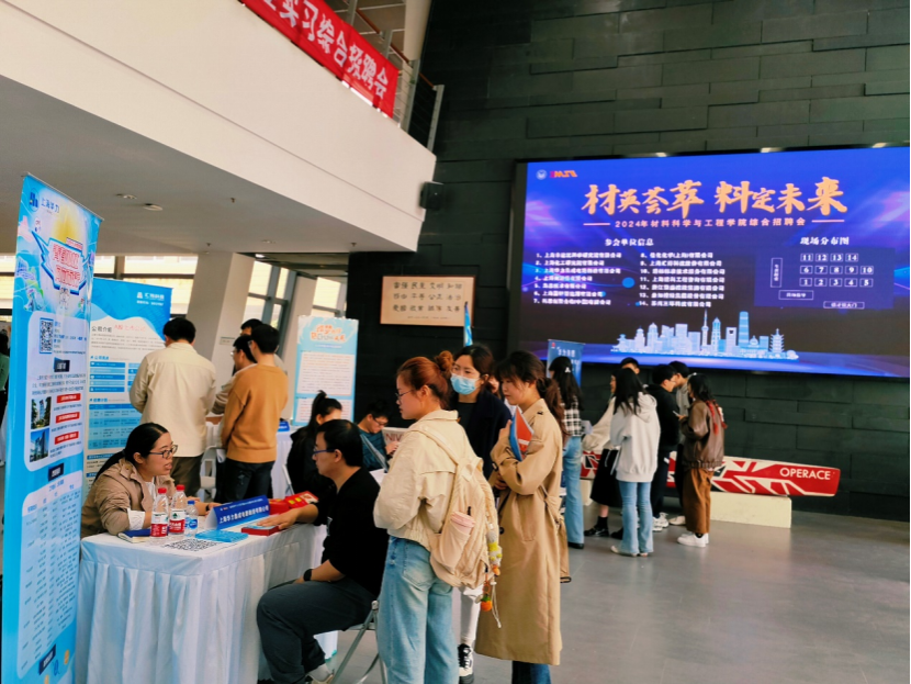 4月23日下午,“材”英荟萃,“料”定未来——6776永利集团2024年就业实习招聘会在嘉定校区德才馆一楼大厅成功举办。本次招聘会吸引了上海市建筑科学研究院有限公司、上海化工研究院有限公司、上海华力集成电路制造有限公司、上海国轩新能源有限公司、科思创聚合物(中国)有限公司、浙江荣盛控股集团有限公司等16家业内知名用人单位参加,为莘莘学子提供了百余个优质就业与实习岗位,涵盖材料、化工、半导体、能源、通信、咨询等多个领域,现场气氛热烈。
