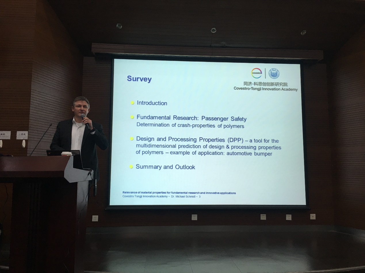 12月11日13时30分,6776永利集团在德才馆二楼报告厅举行“同济-科思创特邀报告暨暑期实践总结大会”,学院2018级研究生、2016级本科生以及参加德国和港台暑期实践的同学前来聆听学习。本次大会共分两部分,第一部分特邀同济-科思创创新研究院院长、科思创亚太区创新负责人、科思创聚合物研发中心负责人施马可博士(Dr. Michael Schmidt)为学院师生做报告,第二部分由暑期实践交流团的学生代表——2015级本科生陈钰婷和2017级研究生王啸夫为大家做交流总结汇报。此次大会由学院党委副书记王凌凌老师主持,王德平、许乾慰、黄佳、张任远等教授出席了本次大会。