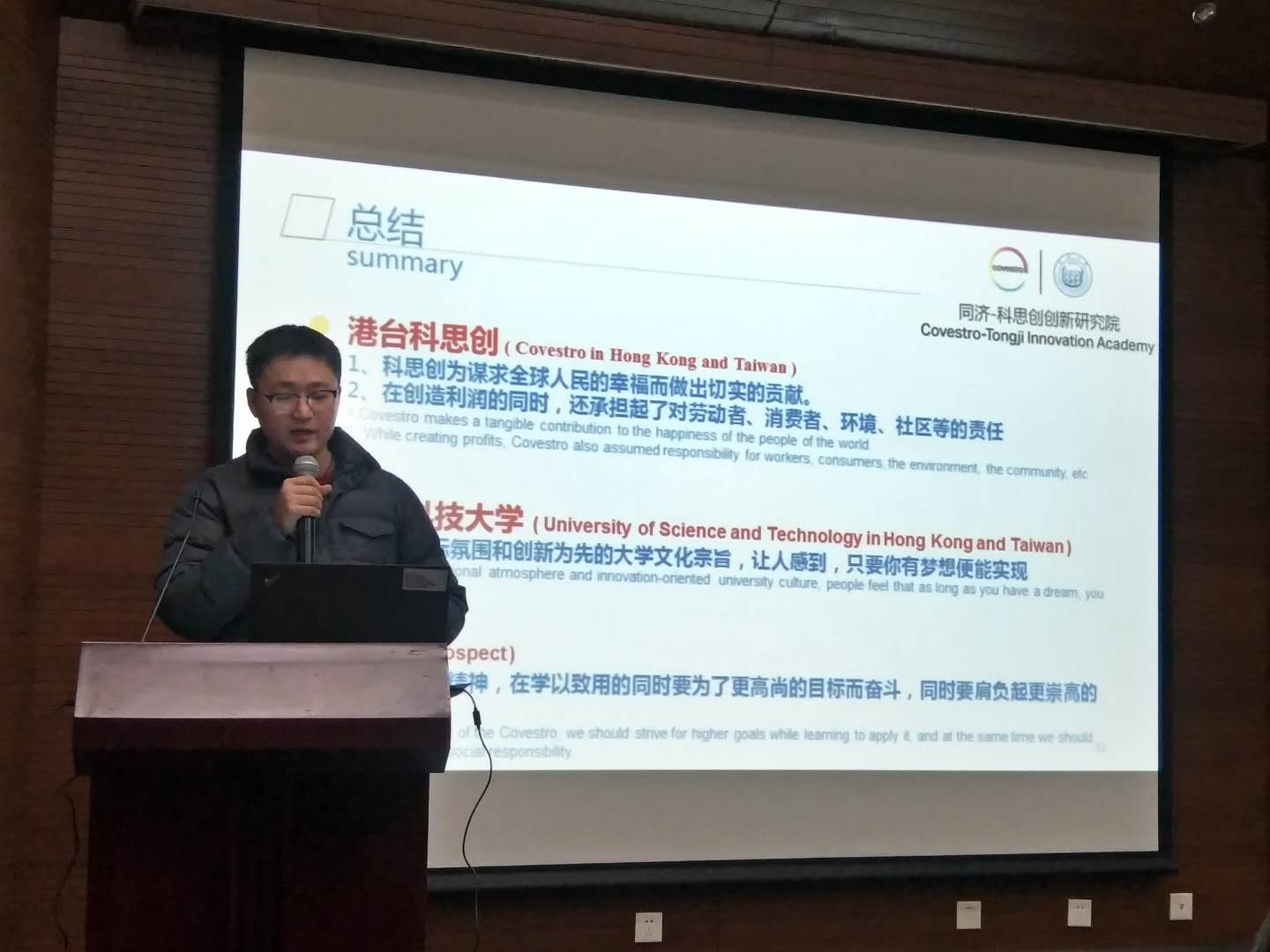 随后,陈钰婷和王啸夫两位同学分别就“暑期德国交流行”和“同济-科思创暑期港台交流行”与在场的嘉宾、老师及同学进行了分享。陈钰婷从企业文化、先进技术、科研及生活等方面介绍了交流团参观科思创德国总部、柏林工业大学以及达姆施塔特工业大学的所得与所想。王啸夫在报告中对参访的企业及学校展开详细的介绍,代表团不仅对港台科思创公司和彰化科思创工厂进行了参观学习,同时还访问了香港科技大学、高雄科技大学和台湾科技大学。在这次的“最美旅行”中代表团学生获益良多,不仅了解了前沿科技与生产技术,培养了科技创新意识,而且还置身于浓厚的国际氛围中,亲身感受到别样的企业文化和社会责任。大家通过此次交流参访,体会到科学精神的永无止境,强烈意识到肩负的社会责任和使命担当。