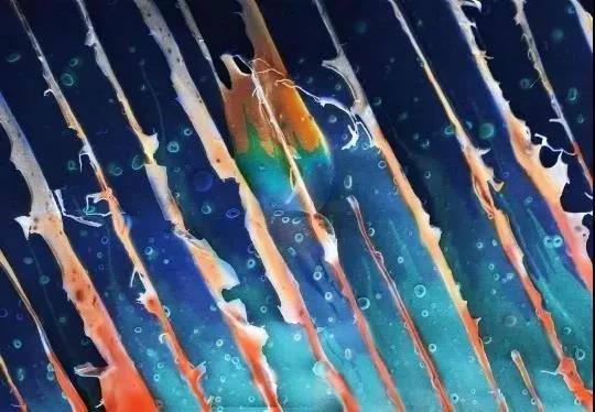 此图为横截面图,高衬度灰色部分为导向孔的横截面电镜图,低衬度白色部分为冻干的水凝胶。我们想到了以水为创作灵感对图片进行艺术化处理,使之呈现出深蓝的大海与层层海浪交替的视觉效果,同时以材料的孔进行颜色层次上的处理营造一种海洋环境下别有他物的生动效果。最后将海浪附上鲜亮的色彩寓意这材料犹如这深邃的大海一般蕴藏着一个丰富多彩的世界,只要对其进行深入的价值探索便会激起如这浪花般的绚丽效果,体现该材料的无限可能和妙不可言的特性所在,故取名为“浪彩海洋”。
