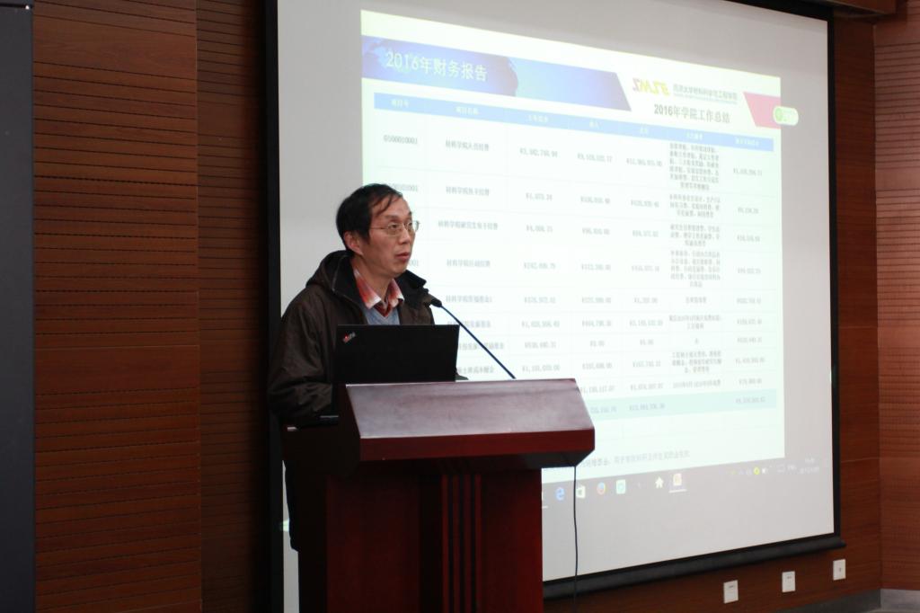 首先,黄云辉主任做了2016年学院工作总结报告。黄云辉主任从学院师资和人才工作、学科建设和科研、人才培养和教学、实验室工作和安全、永利集团、财务情况及今年工作和打算等七方面做了详细介绍。2016年学院顺利完成了领导班子的配备、学科评估、新一轮岗位聘任、院庆六十周年庆祝活动等重要工作。在科研方面通过申报重大项目提升了学院科研实力,科研经费及成果均比往年有了明显提高。教学方面学院正式启动了专业工程教育认证并通过了初审,同时成功申请到学校的人才创新实验区,教学教改及国际交流几个方面也取得了一定的成绩。学院在安全工作方面完善了德才楼的监控系统、做好实验室门禁系统改造工作,学院师生的安全意识有了明显的提升。黄云辉主任总结了学院取得的成绩后,也提出了需要改进的地方并介绍了2017年学院的工作计划。