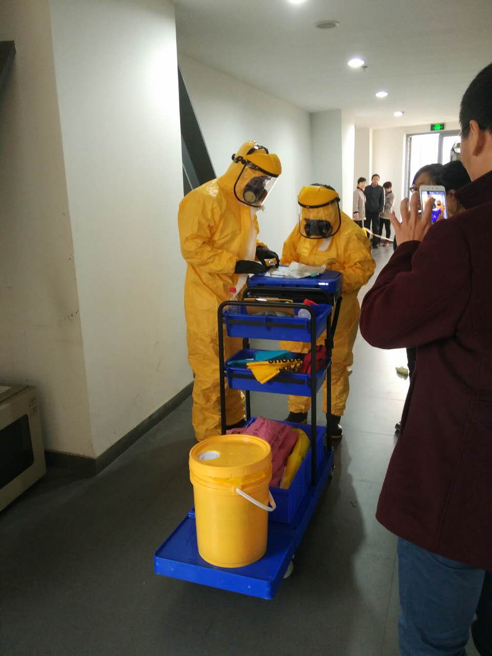 学院安全员立即安排了专业救护队员赶赴现场紧急处置了这一突发事件。依次对“浓硫酸”进行围堵、吸收、中和及处理完毕后处置人员的清洗工作。