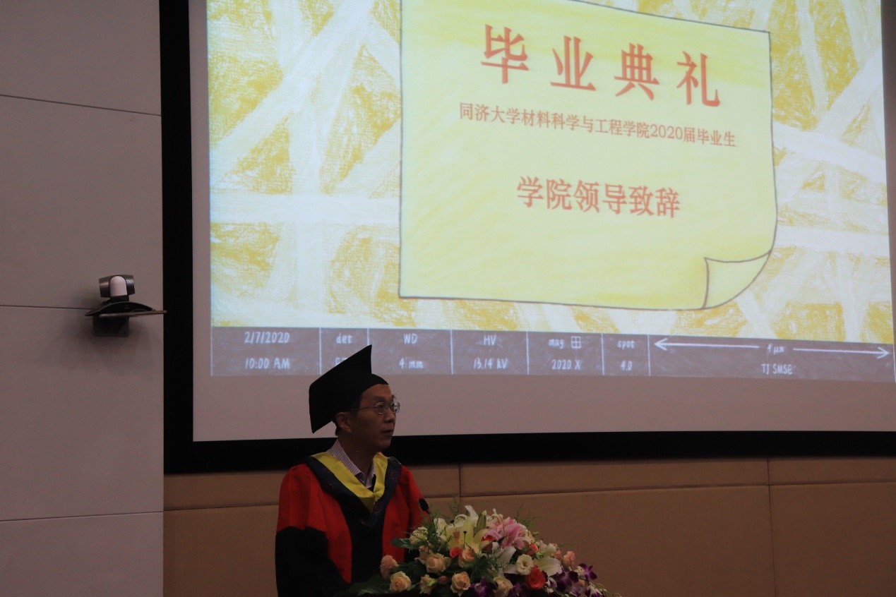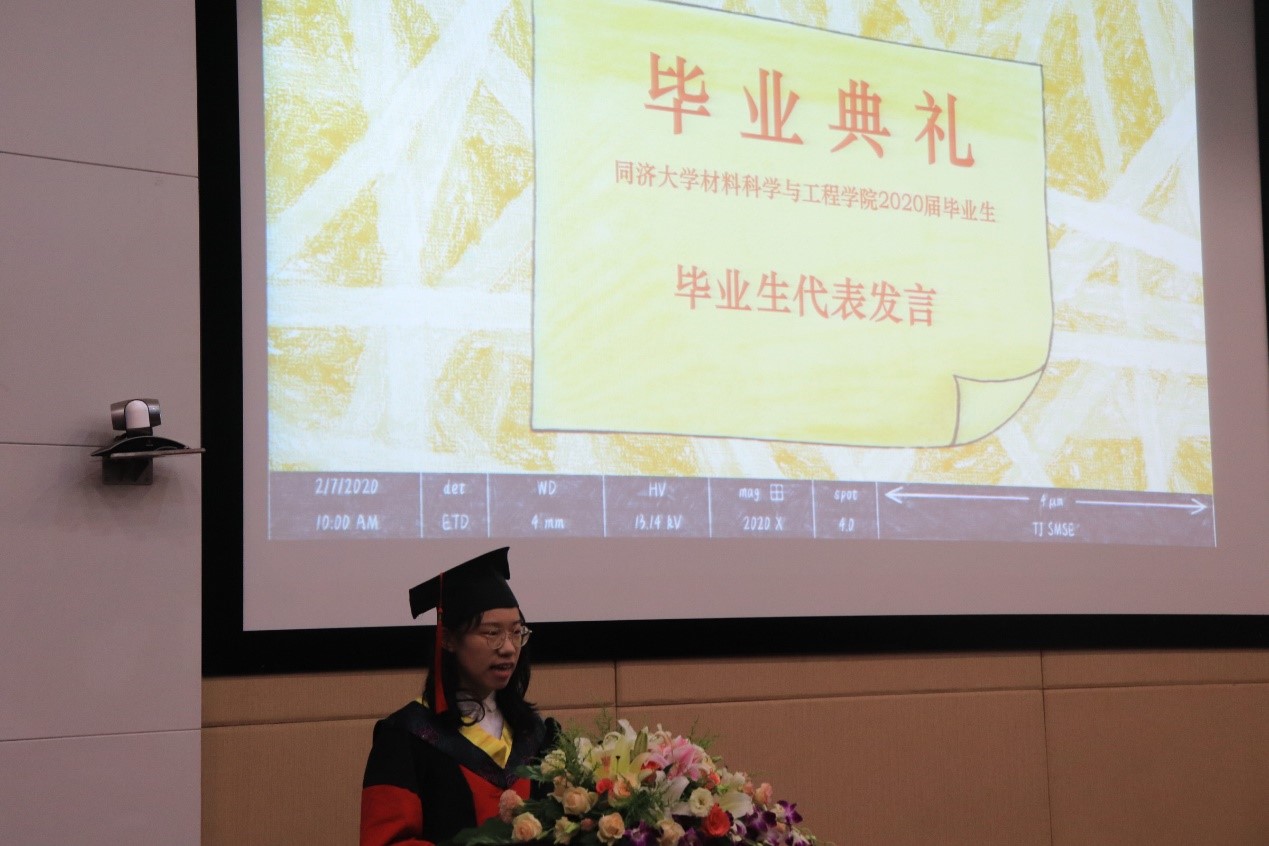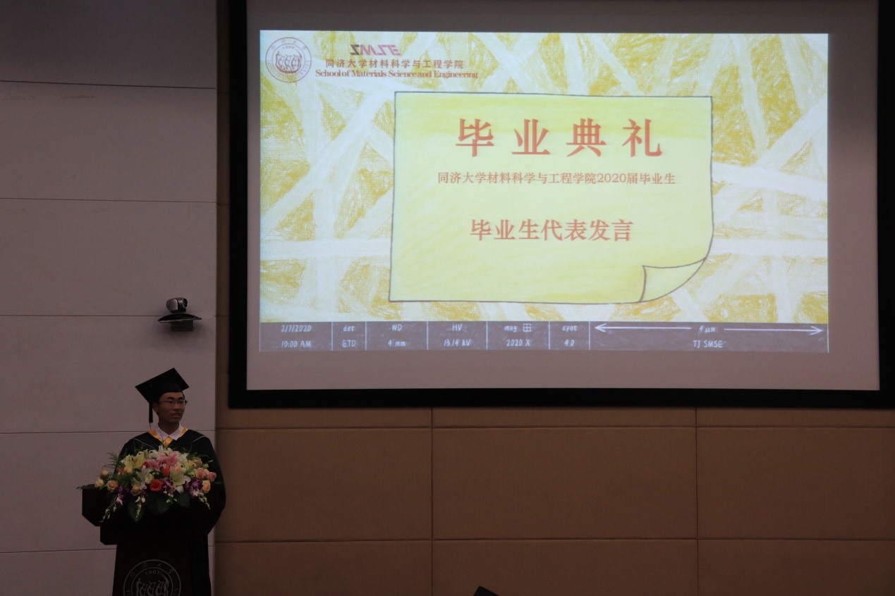 2020年上海市优秀毕业研究生丁元琪博士和上海市本科优秀毕业生何然同学分别代表全体研究生及本科毕业生发言。丁元琪博士回顾了与同济相伴的九个年头,见证了自身在导师的悉心引导以及学院的良好平台下,从一个对科研毫无概念的本科生逐渐成长为可以涉足学术领域的博士的过程。她强调,得到博士学位远远不是终点,但它意味着我们拥有了扎实的功底以及独立思考的能力,这将成为我们未来闯荡世界,遭遇挫折以及追逐梦想时的强大底气。何然同学以点滴细节带大家重温初入校园的心境,第一次在校园迷路,第一次夜晚辗转反侧,第一次品尝的食堂饭菜,第一节学习的课程,当初的热血澎湃仿佛就在昨天。临别降至,他希望同学们无论是奔赴工作岗位或是求学深造,均能牢记“同心同德同舟楫,济人济事济天下”的同济精神,乘风破浪,勇敢奔赴理想,永远年轻,永远热泪盈眶。