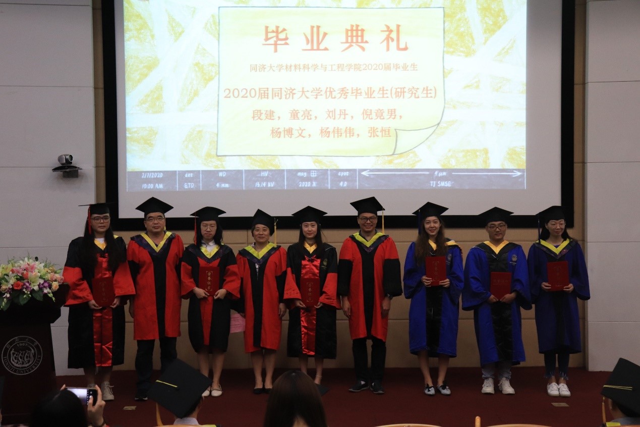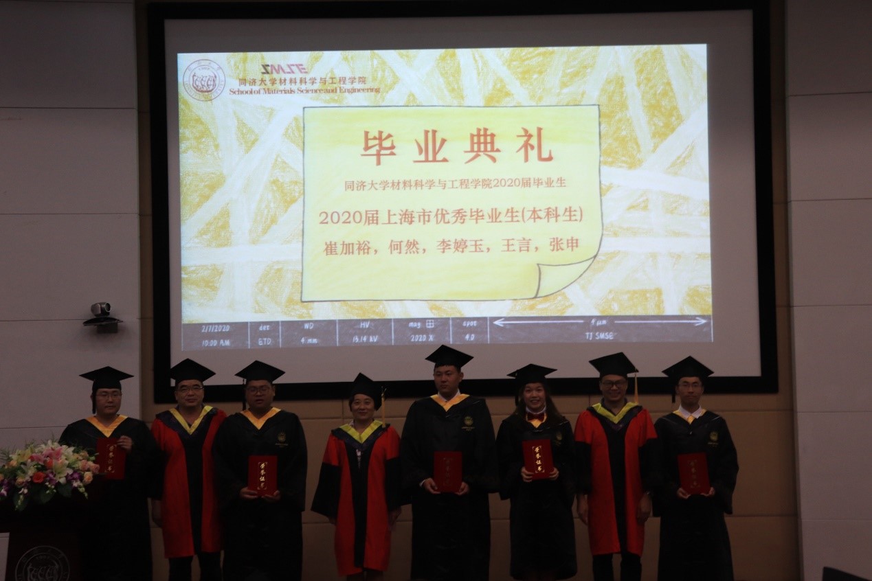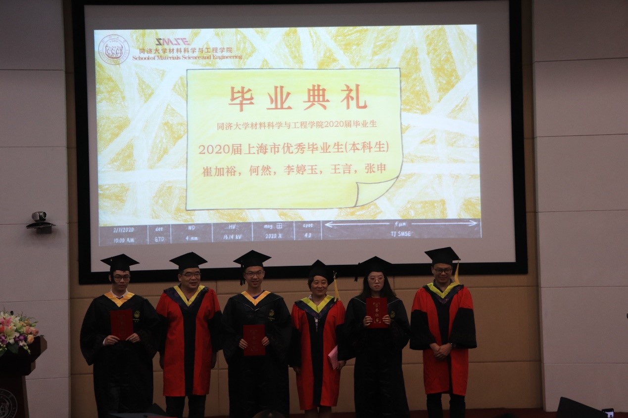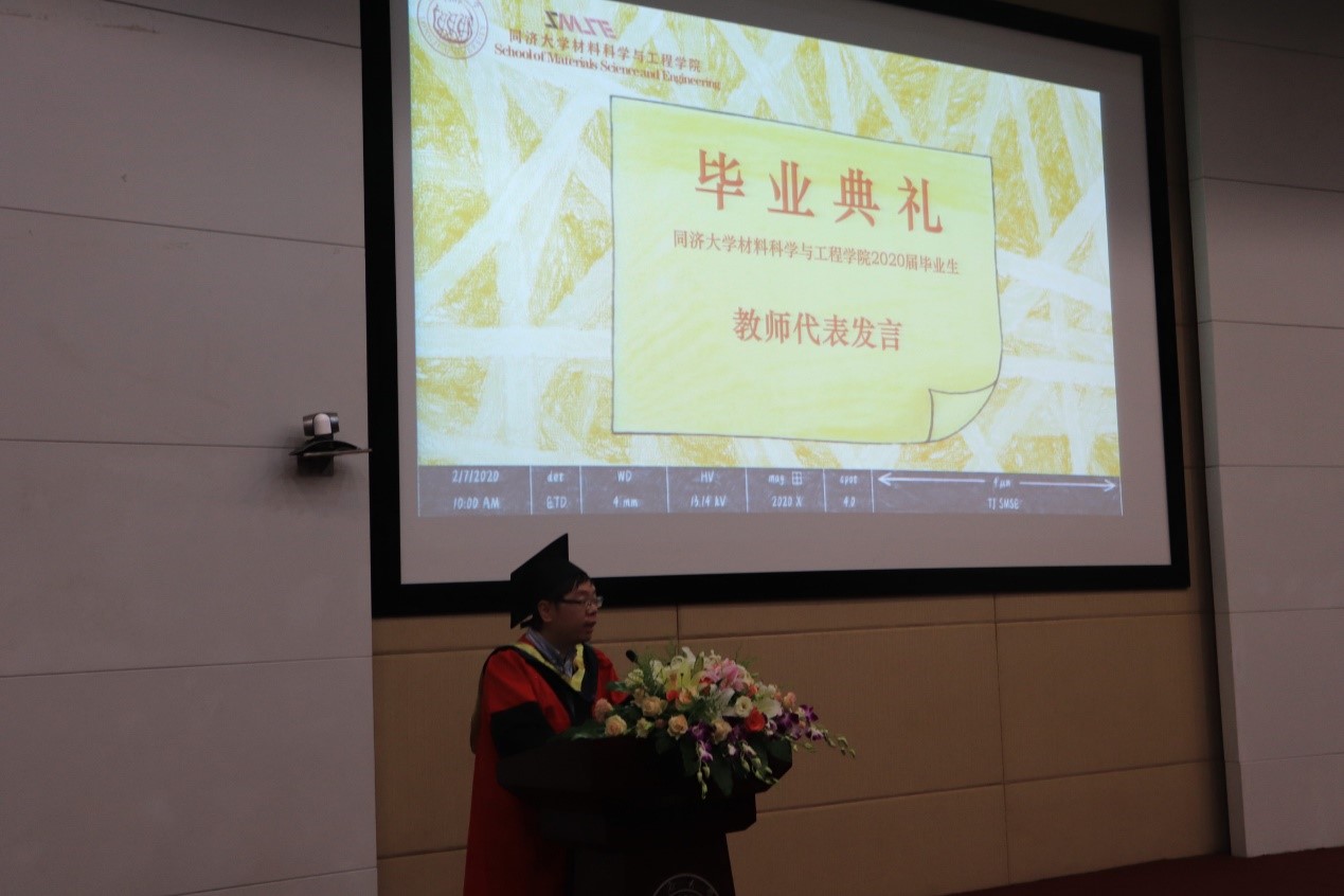 2020年上海市优秀毕业研究生丁元琪博士和上海市本科优秀毕业生何然同学分别代表全体研究生及本科毕业生发言。丁元琪博士回顾了与同济相伴的九个年头,见证了自身在导师的悉心引导以及学院的良好平台下,从一个对科研毫无概念的本科生逐渐成长为可以涉足学术领域的博士的过程。她强调,得到博士学位远远不是终点,但它意味着我们拥有了扎实的功底以及独立思考的能力,这将成为我们未来闯荡世界,遭遇挫折以及追逐梦想时的强大底气。何然同学以点滴细节带大家重温初入校园的心境,第一次在校园迷路,第一次夜晚辗转反侧,第一次品尝的食堂饭菜,第一节学习的课程,当初的热血澎湃仿佛就在昨天。临别降至,他希望同学们无论是奔赴工作岗位或是求学深造,均能牢记“同心同德同舟楫,济人济事济天下”的同济精神,乘风破浪,勇敢奔赴理想,永远年轻,永远热泪盈眶。