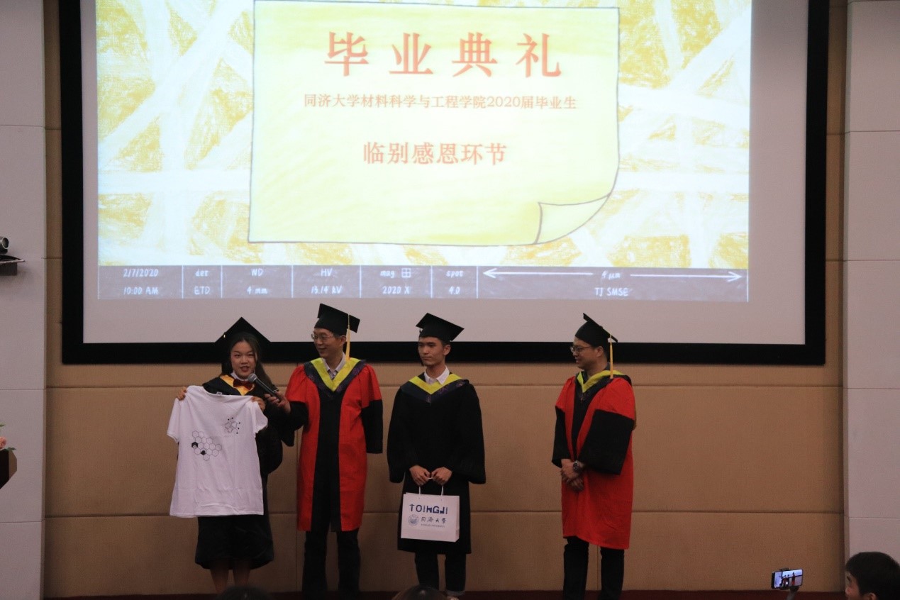 典礼特别设置了临别感恩环节,毕业生代表李振潮同学向学院赠送全年级纪念册,将数载大学生活定格学院珍藏,特别介绍了典礼宣传背景板,专门选用扫描电镜下碳纤维的图片影像,以表达对学院的热爱和不舍。同时,毕业生代表李婷玉同学向学院赠送了毕业T恤纪念品并进行讲解。T恤正面印有血清素和多巴胺分子式,象征着充满活力的大学学习生活,反面印有由原子变成苯环的图案,象征着材料学子四年间的蜕变与成长,表达了毕业生对学院传授专业知识的感激,以及将梦想书写在祖国的大地上的决心。学生代表向出席典礼的教师代表敬献鲜花,感谢学院老师的悉心培养和谆谆教诲。
