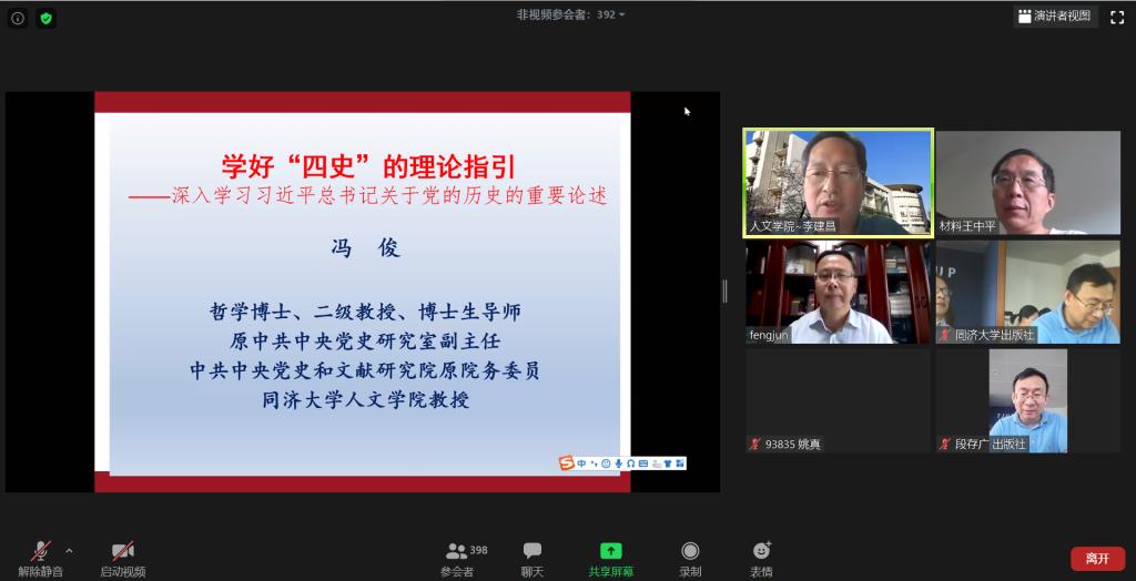 为深入学习习近平新时代中国特色社会主义思想,加强“四史”学习,9月22日下午,6776永利集团党委联合人文学院、出版社、艺术与传媒学院和机械学院党委通过线上平台联合举办了《学好“四史”的理论指引——深入学习习近平总书记关于党的历史的系列重要论述》的线上讲座,学习讲座由人文学院党委书记李建昌主持,主讲人为人文学院教授、原中共中央党史研究室副主任、中共中央党史和文献研究院原院务委员(副部长级)的冯俊教授。材料学院、人文学院、艺术与传媒学院、机械学院、出版社的教职工、学生党员和入党积极分子共计800余人参加了讲座。