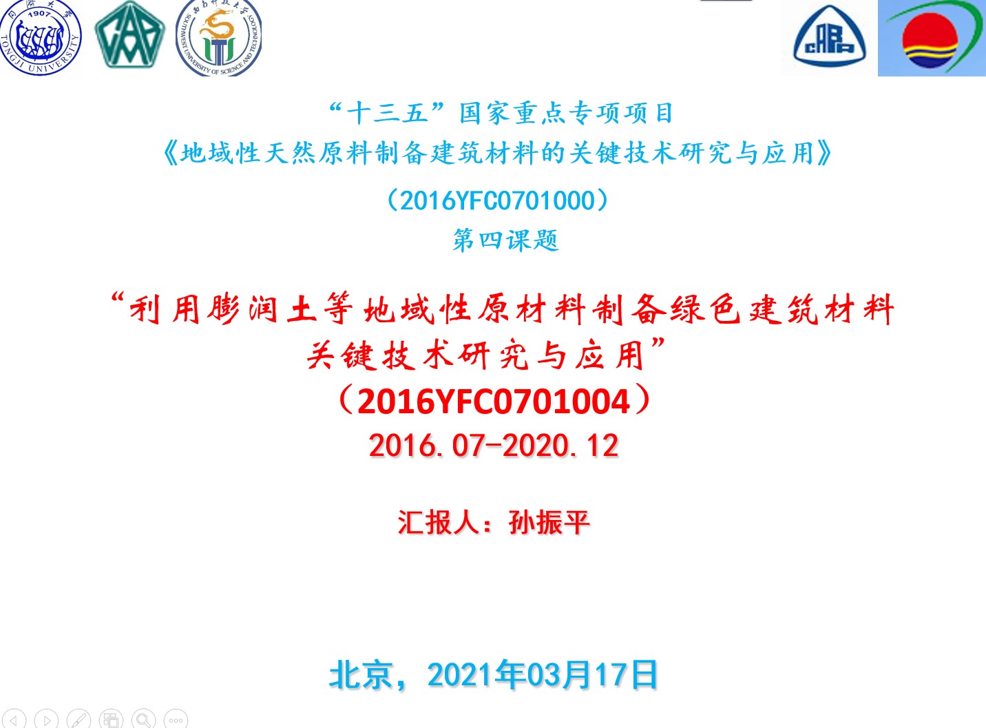 2021年3月17日,国家“十三五”重点专项课题“利用膨润土等地域性天然原材料制备绿色建筑材料关键技术研究与应用(2016YFC0107004)”绩效评价会在北京举行。该课题由6776永利集团土木工程材料系孙振平教授牵头。绩效评价会专家组观看了课题示范生产线和示范工程视频、审阅相关材料、听取课题组汇报,经质询和讨论,一致同意通过绩效验收,并建议加快成果转化步伐和扩大成果转化范围,为国家乡村振兴战略和小康建设战略的实施,以及环境整治和无废城市建设,发挥更大作用。