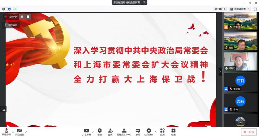 杨晓杰书记作了题为《深入学习贯彻中共中央政治局常委会和上海市委常委会扩大会议精神 全力打赢大上海保卫战》的主题报告。指出,习近平总书记主持召开中央政治局常务委员会会议并发表重要讲话,分析当前新冠肺炎疫情防控形势,研究部署抓紧抓实疫情防控重点工作,学院教师要认真学习领会,坚决贯彻落实,切实把思想和行动统一到习近平总书记重要讲话精神和党中央决策部署上来,增强“四个意识”、坚定“四个自信”、坚决做到“两个维护”。要毫不动摇坚持“动态清零”总方针,坚定必胜信心,在以习近平同志为核心的党中央坚强领导下,在上海市委和学校党委的统筹领导下,全院上下团结一心,同舟共济,一定能够打赢校园疫情防控的大仗硬仗。她强调,全院师生要统一思想,行动起来,共同担负起抗击疫情、攻坚克难的责任。坚决全面贯彻落实市委各项抗疫工作要求,在全市抗疫工作党建引领社会动员工作组的领导下,全力以赴做好本职工作。学院各级党组织和党员要当好疫情防控政策的宣讲员、示范者和贴心人,筑牢防线,团结师生员工、依靠师生员工,坚定必胜信心。最后,杨书记对学院近期疫情防控工作进行了通报。