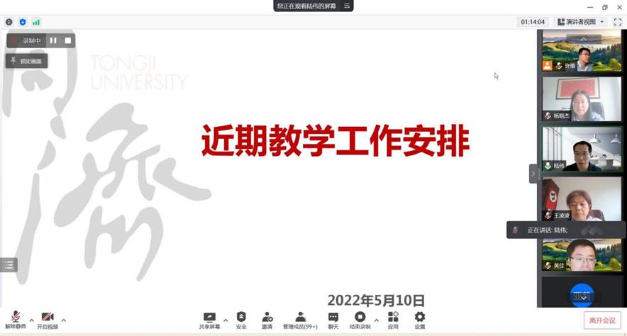 陆伟副院长通报了学院近期教学工作安排。陆老师首先通报了学校关于疫情期间后续教学工作安排的通知,指出教学工作仍以线上形式按照校历安排正常开展,同时要保质保量地完成教学工作。随后,陆老师就本科生毕业论文工作、期末考试工作、实习工作、主修专业确认工作、培养方案修订工作等进行了部署,并对研究生培养方案修订、学位审核工作、中期考核工作、招生工作及日常工作等进行了安排。要求各位老师采用多种途径与学生交流,关心学生学习和生活,实时了解学生情况。