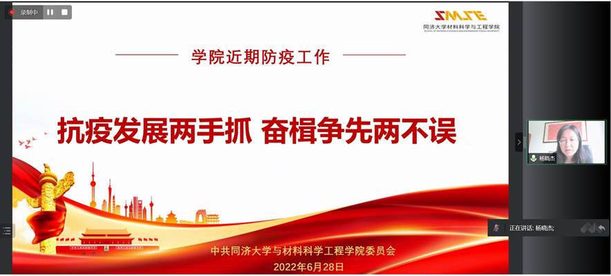 杨晓杰书记作了题为《抗疫发展两手抓 奋楫争先两不误》的主题报告对学院近期防疫工作进行介绍。在校区管理方面,自3月13日校园进入准封闭管理以来,学院秉承全校抗疫一盘棋的理念,积极投身抗疫一线,集结学院教师党员、青年教师,快速组建学院青年突击队。在嘉定校区抗疫专班、核酸检测一线、流调循迹排查、静态网格运行保障、校区健步走活动等,处处可见材料人的身影,用志愿红筑起防疫的“红色屏障”,让党旗在抗疫一线高高飘扬。在教学保障方面,根据学校要求,学院迅速开展线上教学工作,汇聚云端“抗疫力量”,将“停课不停学”落到实处,协同全体师生同心战“疫”,共克时艰,全力以赴把好校门关,打好防疫战。在科研攻坚方面,疫情期间,学院迎难而上,坚持做好科研工作整体推进。学院教师的基金申请、论文发表等科研任务有序开展,并未因为疫情的影响而停步。在抓好校园疫情防控工作的同时,学院教师申报杰青、优青、海外优青以及青年和面上等基金项目共计93项,申请教育部奖项2项。同时推出了系列同济-科思创“杰出学者”和“青年学者”系列讲座,内容涵盖了新型能源材料、碳基纳米材料、生物医用材料、低碳绿色建筑材料等学院重点发展的科研方向,为同学们送上了别具特色的“学术大餐”。截至5月底,系列讲座吸引2000余人次聆听学习,帮助同学们了解学科前延,拓展科研思路。在社区服务方面,学院党委及时传达上海市及学校党委的疫情防控要求,号召居家党员在社区一线发挥先锋作用,第一时间投身社区疫情防控工作。不完全统计,3-5月份,学院教工有80余人参与到了所在社区疫情防控工作中,在志愿服务中彰显了“同济担当”。最后,杨晓杰书记向逆行在校内工作的教师们致敬!向全心投入线上教学和科研的教师们致敬!向投身社区志愿服务的教师们致敬!