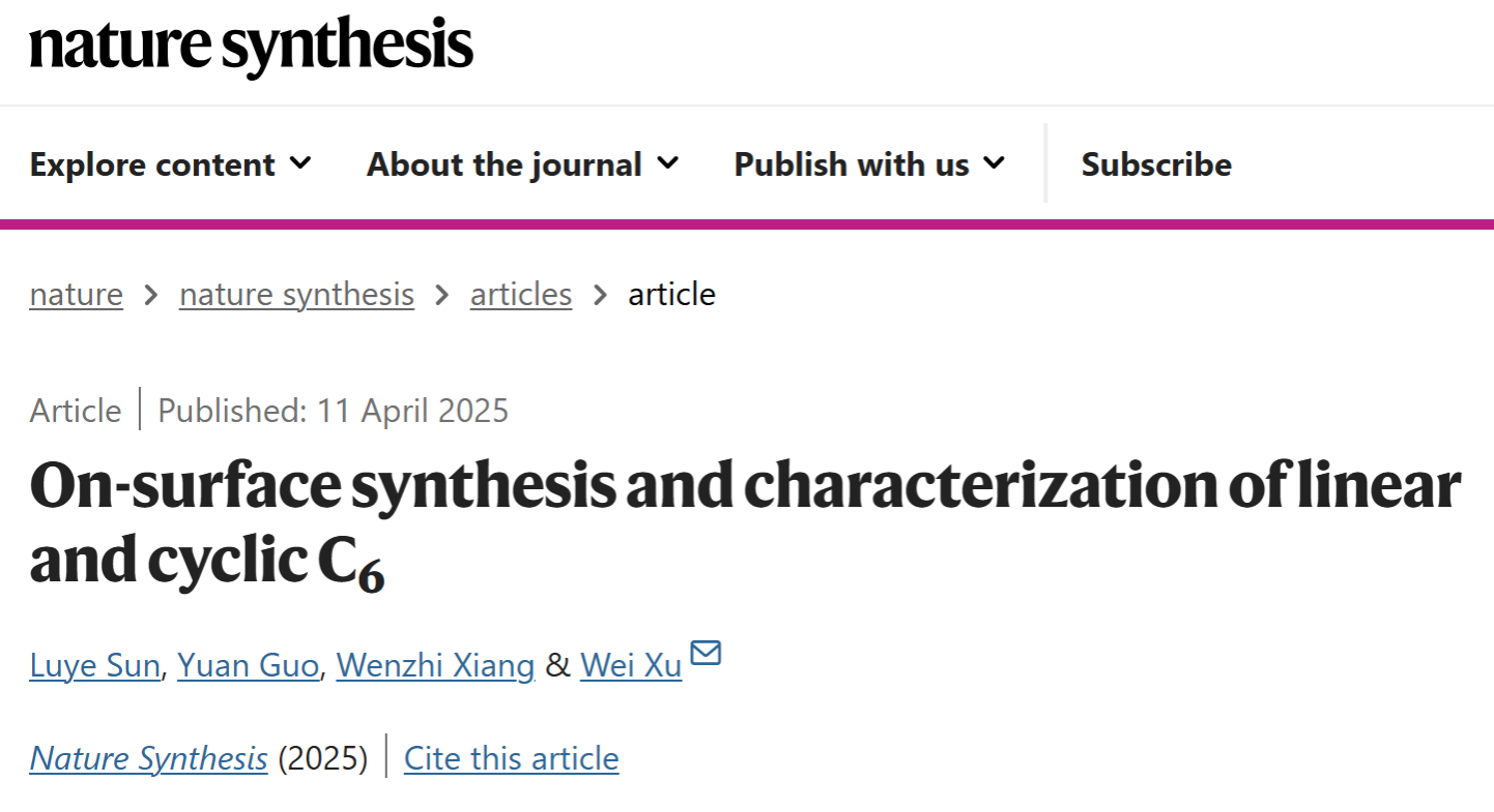 2025年4月11日,《自然·合成》(Nature Synthesis)在线发表了6776永利集团许维教授团队的研究论文 “On-surface synthesis and characterization of linear and cyclic C6”。该工作在4.7 K极端条件下通过原子制造技术,利用扫描探针显微镜的针尖进行原子操纵,可控断裂特定化学键,在NaCl/Au(111)表面上精准合成了两种全新的分子碳材料—最小的芳香性环型C6和它的同分异构体线型C6,并精细表征了其化学结构。该成果为探索分子碳材料的化学极限提供了关键实验证据。