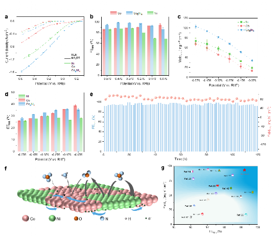 为此,学院程洪飞特聘研究员团队设计了用于电催化还原硝酸盐制氨的高性能催化剂。本研究揭示了催化反应中钴和氢氧化钴相互转化的原因,并通过在钴中引入镍纳米晶构筑了Co6Ni4异质结构催化剂。该催化剂通过异质界面调控中间体的吸附、改善电子转移,抑制了低活性钴物种的积累,实现了高效稳定的催化反应。