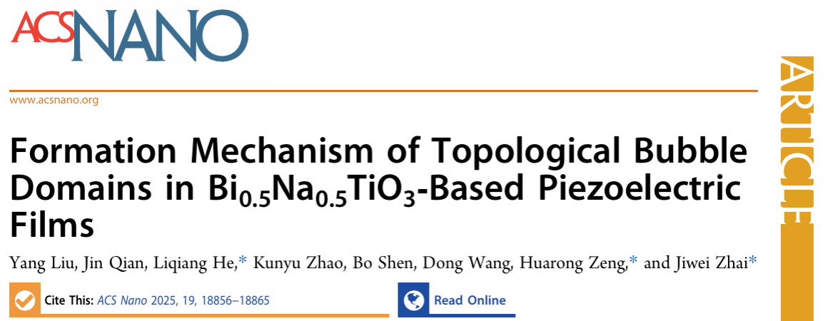 该研究成果以以“Formation mechanism of topological bubble domains in Bi0.5Na0.5TiO3‑based piezoelectric films”为题发表于《ACS 纳米》(ACS Nano)上。论文第一作者为yl6776永利集团在读博士生刘阳。通讯作者为yl6776永利集团翟继卫教授、中科院上硅所曾华荣研究员和西安交通大学何利强博士。该研究工作得到了国家自然科学基金、国家重点研发计划等项目的资助。
