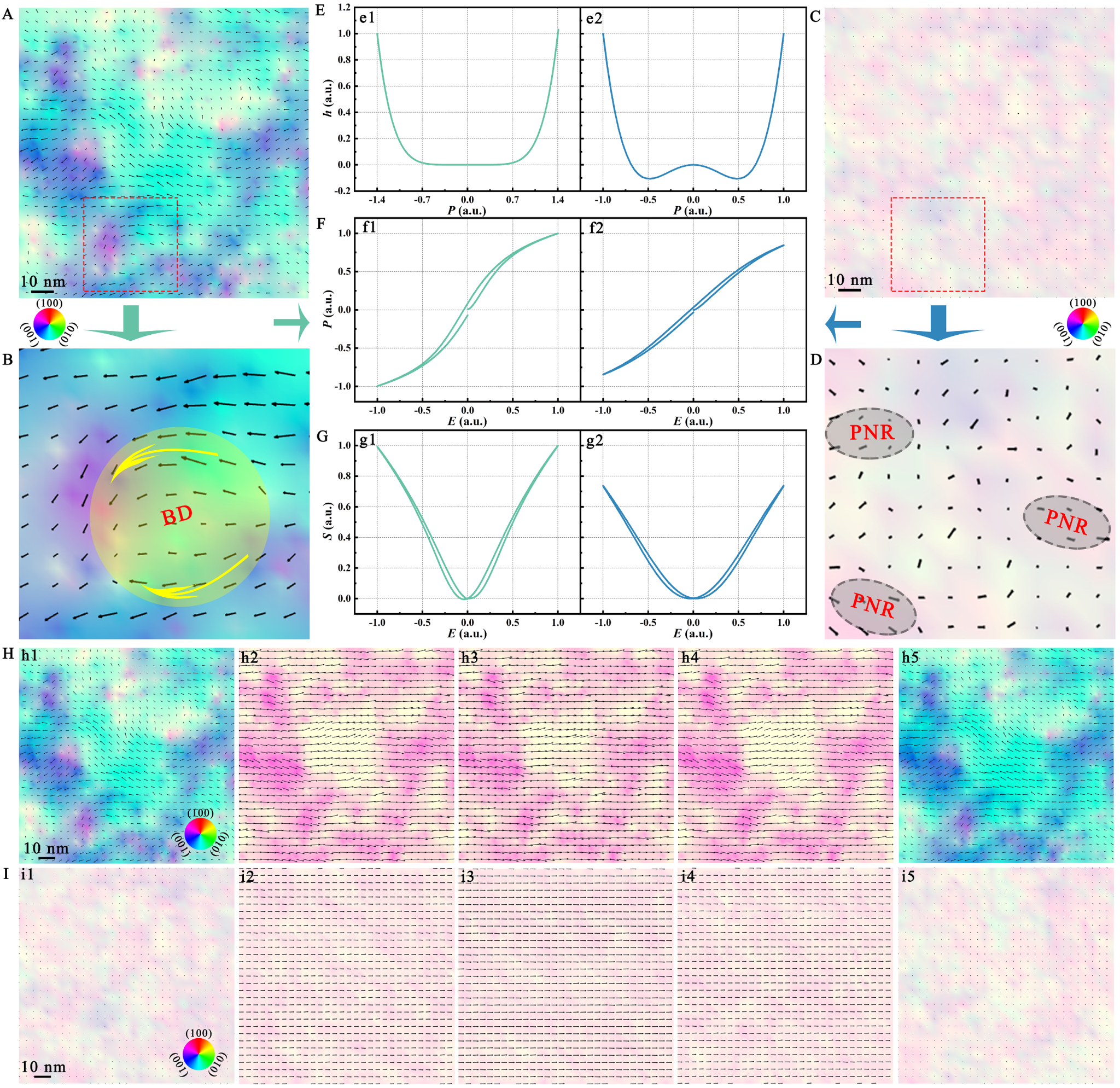 翟继卫教授研究团队设计和实现了Bi0.5Na0.5TiO3压电薄膜中拓扑BDs的构筑,建立并阐明了BDs与薄膜宏观极化和应变响应之间的关系。BDs的出现降低了偶极子或畴翻转的能垒,这一优势与BDs在电场作用下的极化旋转以及BDs和传统电畴之间旋转衔接偶极子所产生的最小化极化通量相结合,导致了增强的应变响应。此外,研究发现,持续的驱动电压和温度升高对BDs有擦除作用。同时,消亡的BDs可以在一段时间内自动恢复到初始状态。这些发现加深了对BDs的认识,为促进极性拓扑压电/应变材料的发展提供了理论指导和实验支撑。