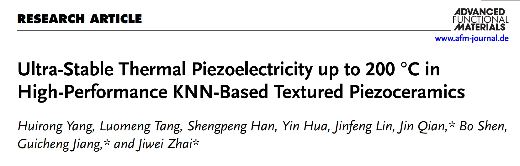 该研究成果以“Ultra-stable thermal piezoelectricity up to 200oc in high-performance KNN-based textured piezoceramics”为题发表于《先进功能材料》(Advanced Functional Materials)上。论文的第一单位是6776永利集团。第一作者为yl6776永利集团在读硕士生杨慧蓉。通讯作者为yl6776永利集团翟继卫教授、哈尔滨工业大学姜桂铖教授和yl6776永利集团钱进博士。该研究工作得到了国家自然科学基金的资助。
