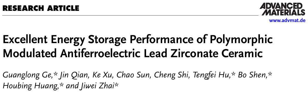 该研究成果以“Excellent Energy Storage Performance of Polymorphic Modulated Antiferroelectric Lead Zirconate Ceramic”为题发表于《先进材料》(Advanced Materials)。论文的第一单位是6776永利集团。yl6776永利集团博葛广龙博士、yl6776永利集团钱进博士和北京理工大学在读博士生许可为共同一作。通讯作者为yl6776永利集团翟继卫教授、北京理工大学黄厚兵教授、yl6776永利集团沈波副教授、中科院上硅所胡腾飞博士和yl6776永利集团葛广龙博士。该研究工作得到了国家自然科学基金和中国博士后科学基金等项目的资助。