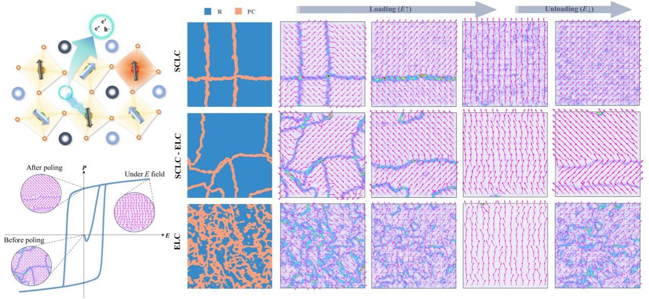 翟继卫教授研究团队提出了一种在BF-BT体系中构建空间电荷-电子传输机制从而增强极化响应的策略。该机制是在相场模拟方法的指导下,在含有A位空位缺陷的基质中通过调控缺陷和载流子的浓度和分布来构建的。该策略可通过降低朗道势垒增强极化响应,并通过双尺度(宏-微畴)畴结构提升畴翻转能力,从而使室温压电系数提升至d33 ~ 205 pC/N。而且,利用电场诱导的相结构演变及大尺寸畴结构可获得高温下稳定存在的极性配置,实现宽温度范围(100 ~ 415°C)内高温压电系数的稳定(310 pC/N,Δ < ± 13%)。