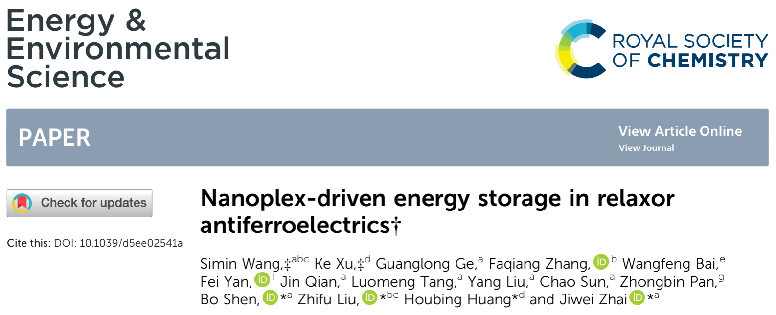 该研究成果以“Nanoplex-driven energy storage in relaxor antiferroelectrics”为题发表于《能源与环境科学》(Energy & Environmental Science)》上。论文的第一单位是6776永利集团。yl6776永利集团在读博士生王思民、北京理工大学在读博士生许可为共同一作。通讯作者为yl6776永利集团翟继卫教授、北京理工大学黄厚兵教授、中科院上硅所刘志甫研究员和yl6776永利集团沈波副教授。该研究工作得到了国家自然科学基金、国家重点研发计划等项目的资助。