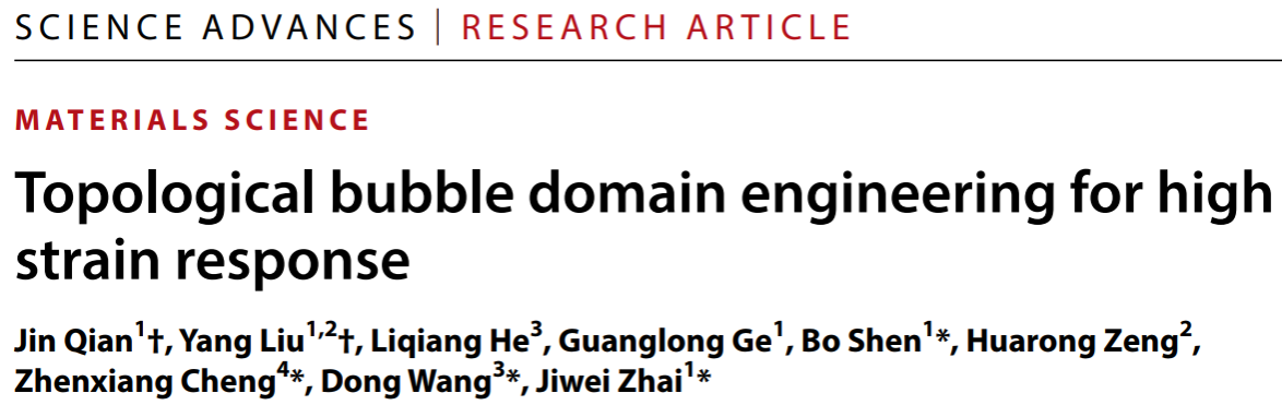 该研究成果以“Topological bubble domain engineering for high strain response”为题发表于《科学进展》(Science Advances)上。论文的第一单位是6776永利集团。yl6776永利集团钱进博士、yl6776永利集团在读博士生刘阳为共同一作。通讯作者为yl6776永利集团翟继卫教授、西安交通大学王栋教授、伍伦贡大学程振祥教授和yl6776永利集团沈波副教授。该研究工作得到了国家自然科学基金的资助。